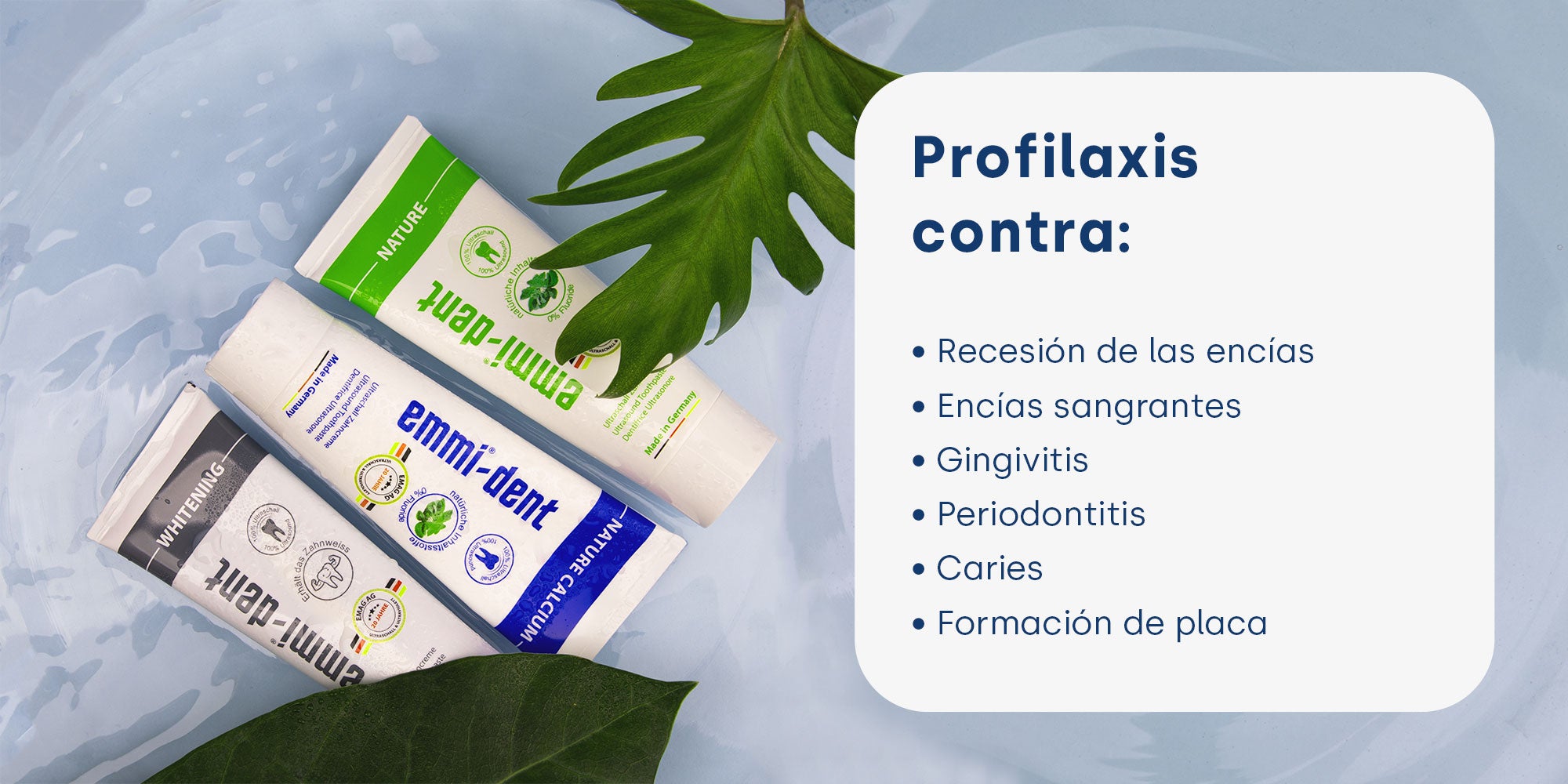 El uso regular de nuestra pasta de dientes ayuda a mantener la blancura natural de tus dientes y a prevenir la decoloración causada por influencias cotidianas como el café, el té o el tabaco. Además, la pasta de dientes emmi-dent garantiza un aliento fresco y una sensación de limpieza en la boca.