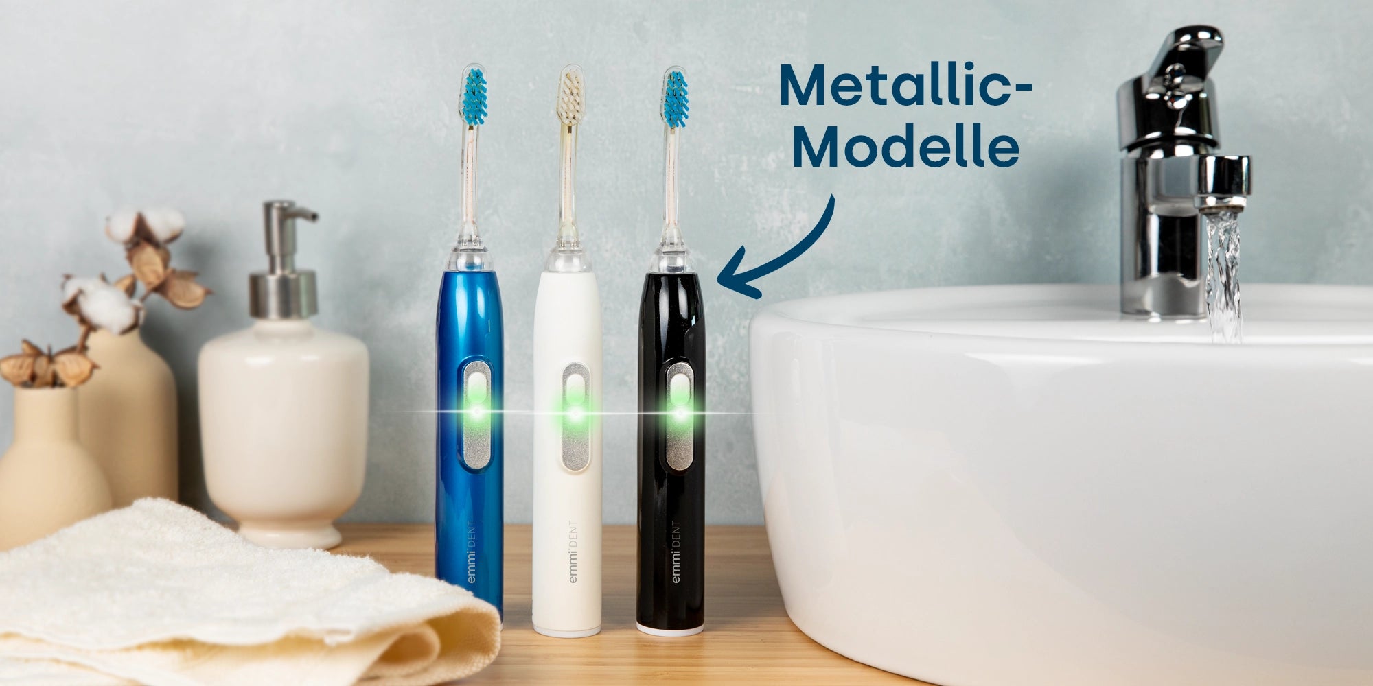 Die emmi-dent Ultraschallzahnbürste Metallic ist das Einsteigermodell der Ultraschallzahnbürsten mit einem 2-Pin System. Das bedeutet, dass das Metallic Modell pro Sekunde 2 Ultraschall-Impulse generiert und somit eine hochmoderne Ultraschallzahnbürste ist, die eine effektive und schonende Zahnpflege ermöglicht. Mit der emmi-dent Ultraschallzahnbürste Metallic investieren Sie in eine qualitativ hochwertige Zahnpflege zu einem fairen Preis.