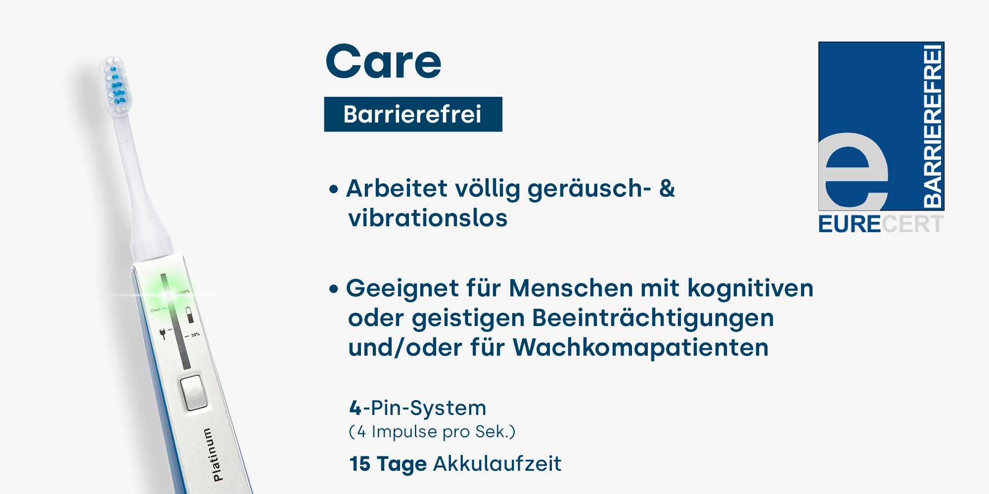Das Care-Modell hingegen ist als barrierefreie Ultraschallzahnbürste konzipiert, die gänzlich ohne Geräusche und Vibrationen auskommt. Sie eignet sich somit hervorragend für Personen mit kognitiven Einschränkungen oder für Wachkomapatienten. Mit dem 4-Pin-System (vier Impulse pro Sekunde) und einer Akkulaufzeit von 15 Tagen setzt sie neue Maßstäbe in der Pflege und Unterstützung.