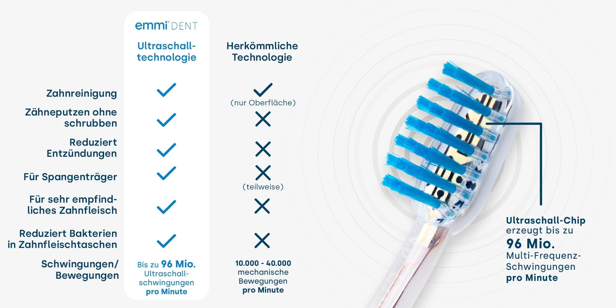 Die Ultraschallzahnbürsten von emmi-dent arbeiten ohne mechanische Bewegung. Der Aufsatz der Ultraschallzahnbürste beherbergt die patentierte Ultraschall-Piezo-Keramikscheibe. Im innovativen Bürstenkopf wird elektrische in Ultraschallenergie umgewandelt, welche dann mittels spezieller Ultraschall-Zahnpasten und dem Speichel auf Zähne und Zahnfleisch übertragen wird. Der Ultraschallgeber wird zu Schwingungen (bis zu 96 Millionen Multifrequenz-Schwingungen) angeregt. Diese Schwingungen brechen die Struktur der in der Zahncreme enthaltenen Mikrobläschen auf, die daraufhin kollabieren und einen Sog erzeugen. Dieser Effekt führt zur Entfernung von Biofilm und Belägen – eine Revolution im Standardprozess des Zähneputzens.