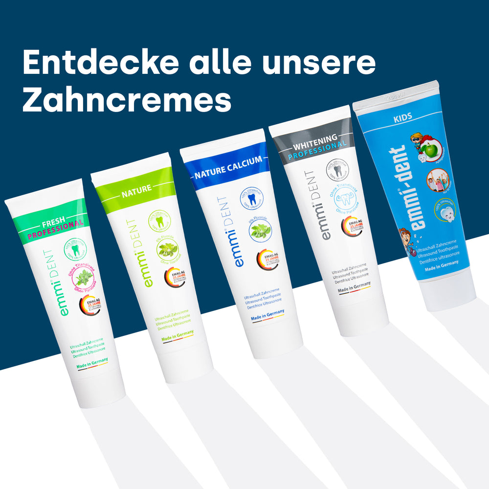 Die emmi-dent Fresh Zahnpasta ist ideal für empfindliche Zähne. Sie reinigt sanft, stärkt das Zahnfleisch und bekämpft Plaque und Zahnstein. Mit natürlichen Inhaltsstoffen sorgt sie für frischen Atem und ein sauberes Gefühl durch die revolutionäre Ultraschalltechnologie.