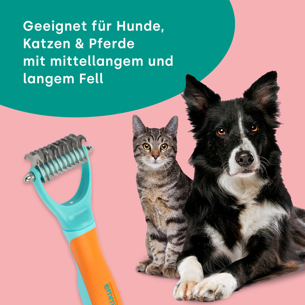 Während des Fellwechsels und bei hoher Pollen- und Staubbelastung ist gründliche Fellpflege unerlässlich. Der emmi-pet Katzen- und Hundekamm dringt mit seinen Edelstahlkanten tief in das Deckfell ein, entfernt schonend Unterwolle und Verfilzungen, ohne die Haut zu verletzen. Die Unterfellbürste eignet sich für kleine Haustiere bis hin zu großen Pferden und verwandelt die Fellpflege in ein entspannendes Wellnessprogramm.