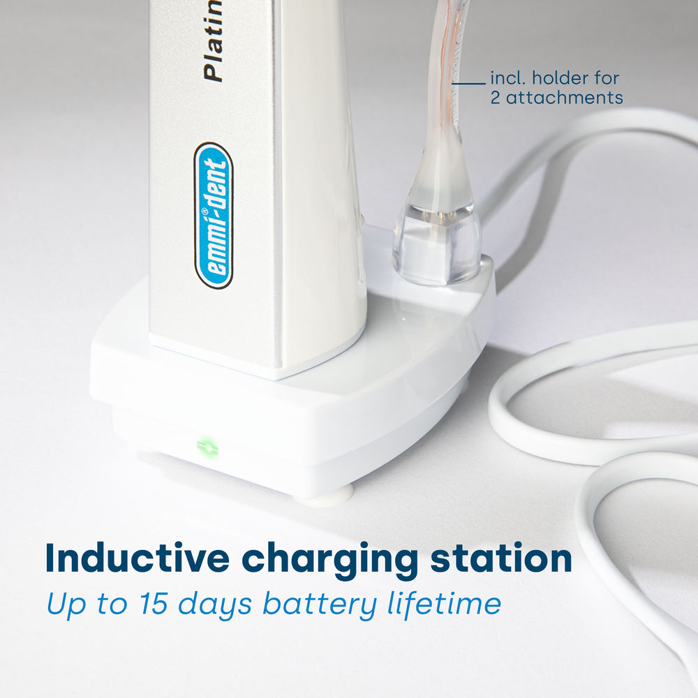 Thanks to the abrasion-free ultrasound technology, the emmi-dent PlatinumCAM is particularly suitable for people with sensitive gums, implants, braces or dental diseases such as periodontitis. The gentle vibrations clean gently without irritating teeth or gums. This keeps your teeth healthy without damaging the tooth enamel.