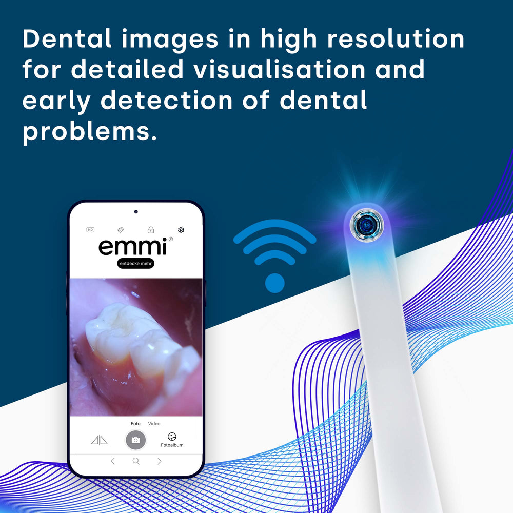 The emmi-dent PlatinumCAM brings a revolutionary innovation in dental care with its integrated dental camera. This camera allows you to inspect the oral cavity in real time. By connecting it to the emmi app on your smartphone or tablet, you can make hard-to-reach areas visible and ensure that your mouth is clean right down to the last corner.