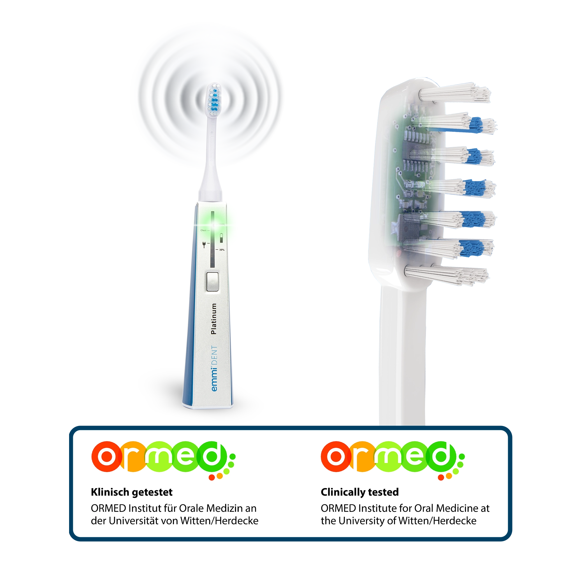 The functionality of our emmi-dent ultrasonic toothbrushes was tested in a clinical study by the University of Witten/Herdecke . Prof. Dr. hcP Gängler, Managing Director of the Institute of Oral Medicine, assessed the test of our emmi-dent ultrasonic toothbrushes with the following words: "Cleaning teeth using ultrasound without brushing motion safely and thoroughly removes plaque and biofilm. This technology prevents damage to the necks of teeth, gums, and teeth. This toothbrush is particularly suitable for people with sensitive teeth. The abrasion-free application actively prevents gum injuries. Furthermore, regular use actively promotes the reduction of gingivitis."