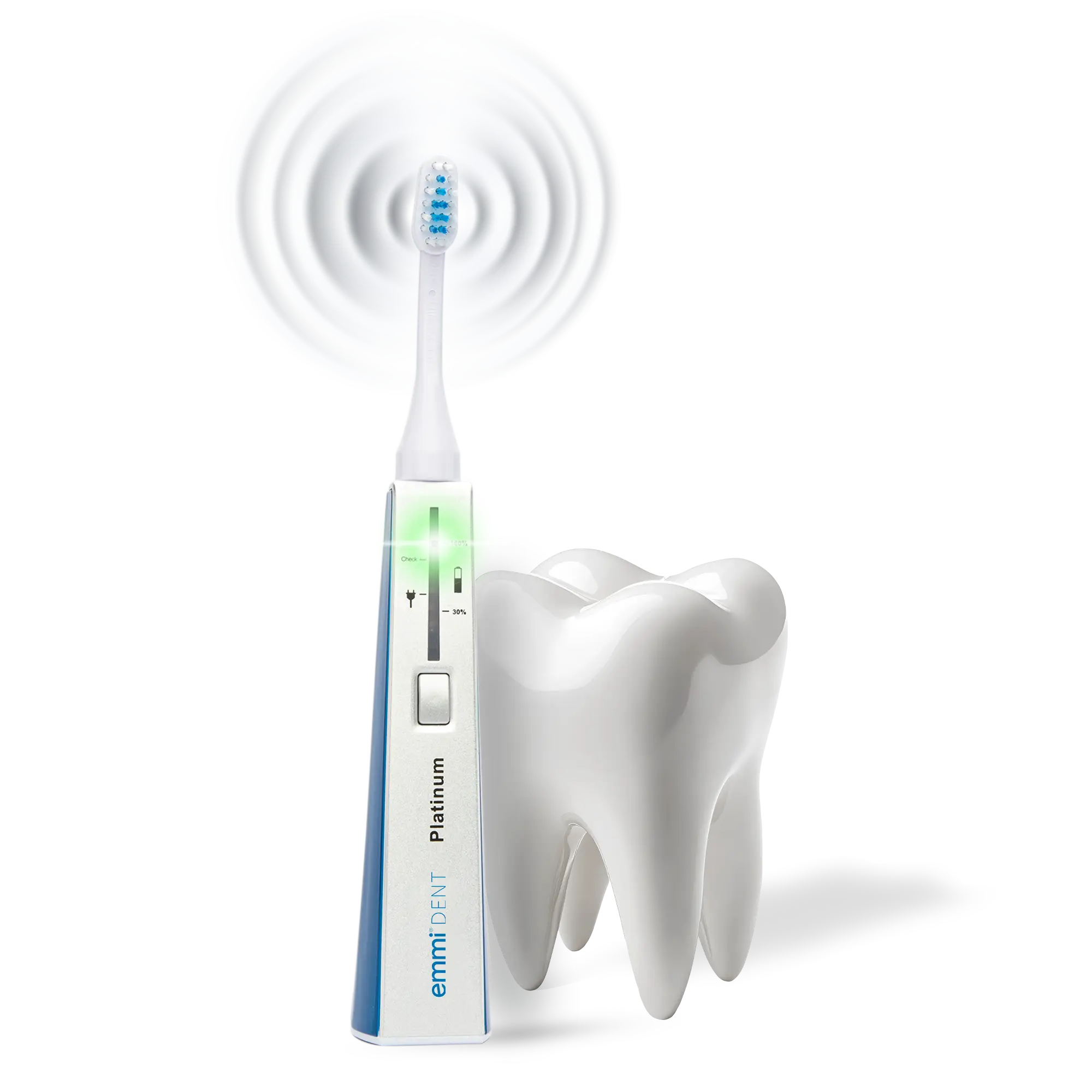 Electric toothbrushes include rotary toothbrushes, sonic toothbrushes and ultrasonic toothbrushes. While the former usually have round brushes that rotate alternately from left to right, sonic toothbrushes are equipped with elongated, vibrating heads. With 20,000 to 40,000 vibrations per minute, they achieve significantly higher mechanical movements than rotary brushes. Ultrasonic toothbrushes are a completely different technology. While rotary and sonic toothbrushes remove the biofilm with the help of mechanical movements, the emmi-dent Platinum Care works with up to 96 million ultrasonic vibrations per minute and does not require any mechanical movements to clean teeth. Motionless tooth cleaning thanks to the latest ultrasonic technology or brushing teeth without scrubbing.