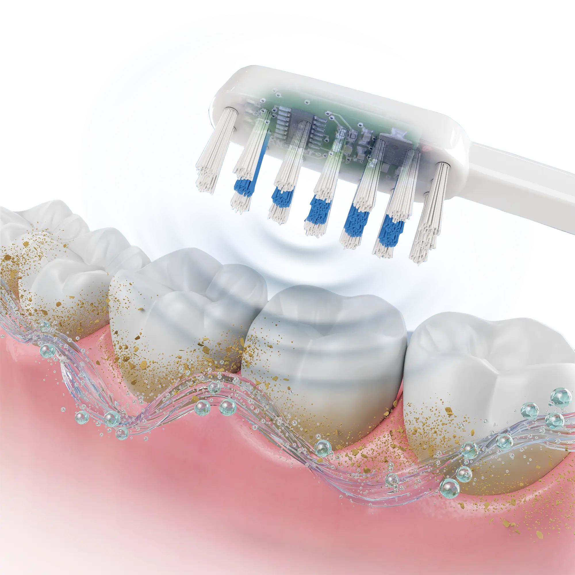 The fine ultrasonic vibrations penetrate deep into the spaces between teeth and the gums, removing bacteria even in hard-to-reach places and thus effectively preventing tooth decay, plaque and inflammation. With regular use, the reduction of gingivitis and periodontitis can be actively promoted.