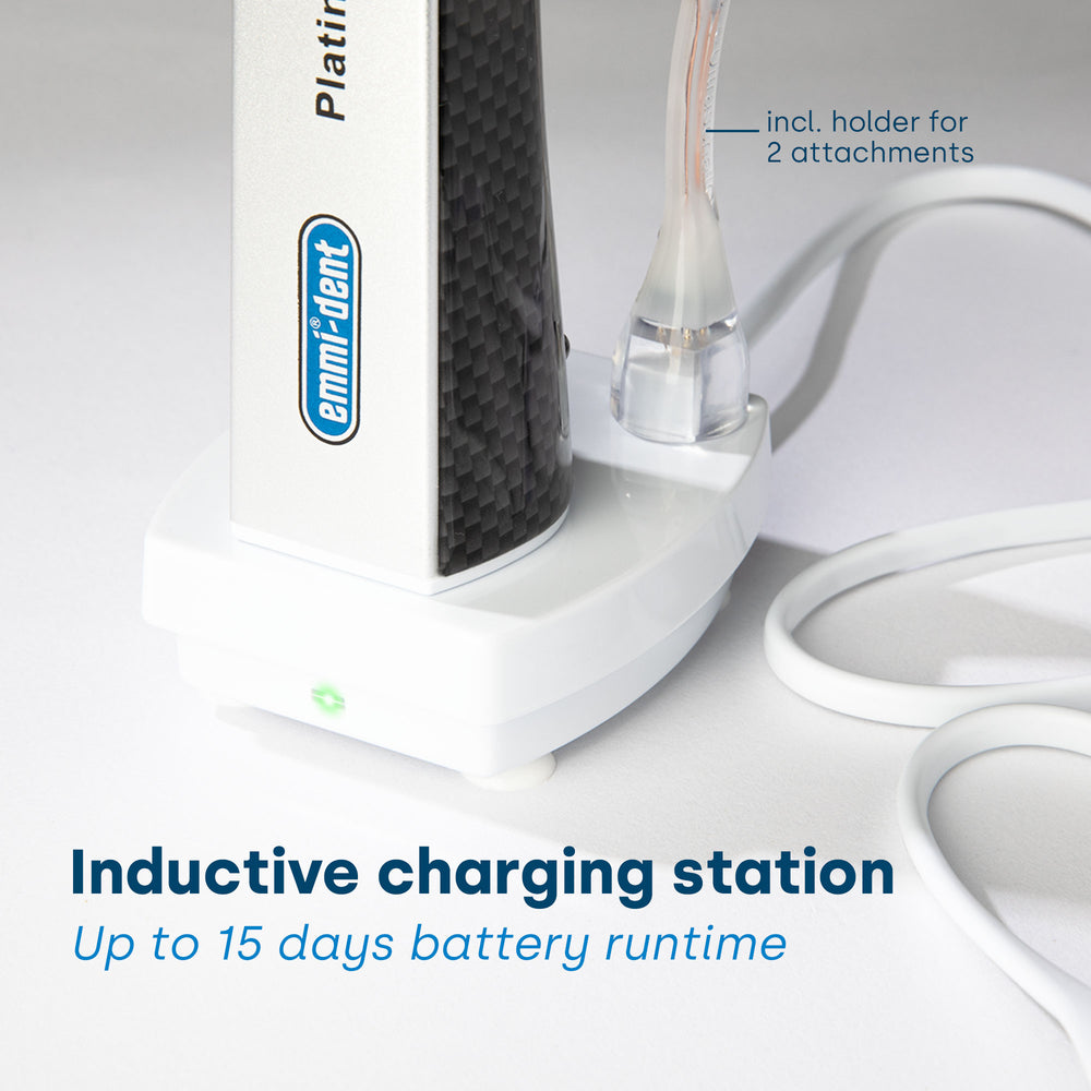 The emmi-dent Platinum has a longer battery life than its predecessor models. With regular use of 2-3 times a day, the Platinum can last up to 15 days before it needs to be recharged. This extended battery life (lithium-ion) offers convenience and uninterrupted use and eliminates the need for frequent charging.