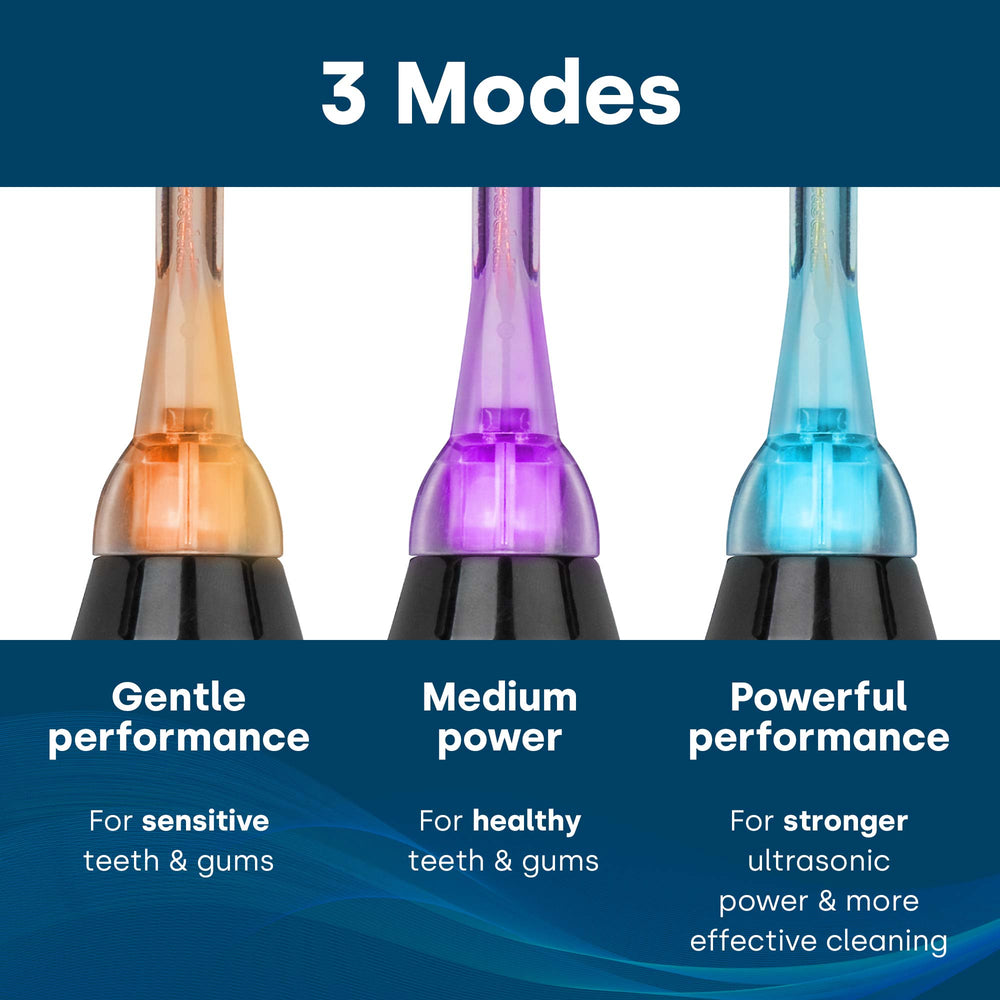 Thanks to the three individually selectable cleaning modes, the ultrasonic toothbrush can be optimally adapted to your needs. The gentle mode provides particularly gentle cleaning and is ideal for sensitive teeth and gums. The medium mode is perfect for daily dental care, while the strong mode offers a more intensive cleaning with increased ultrasonic power – for an especially clean feeling.