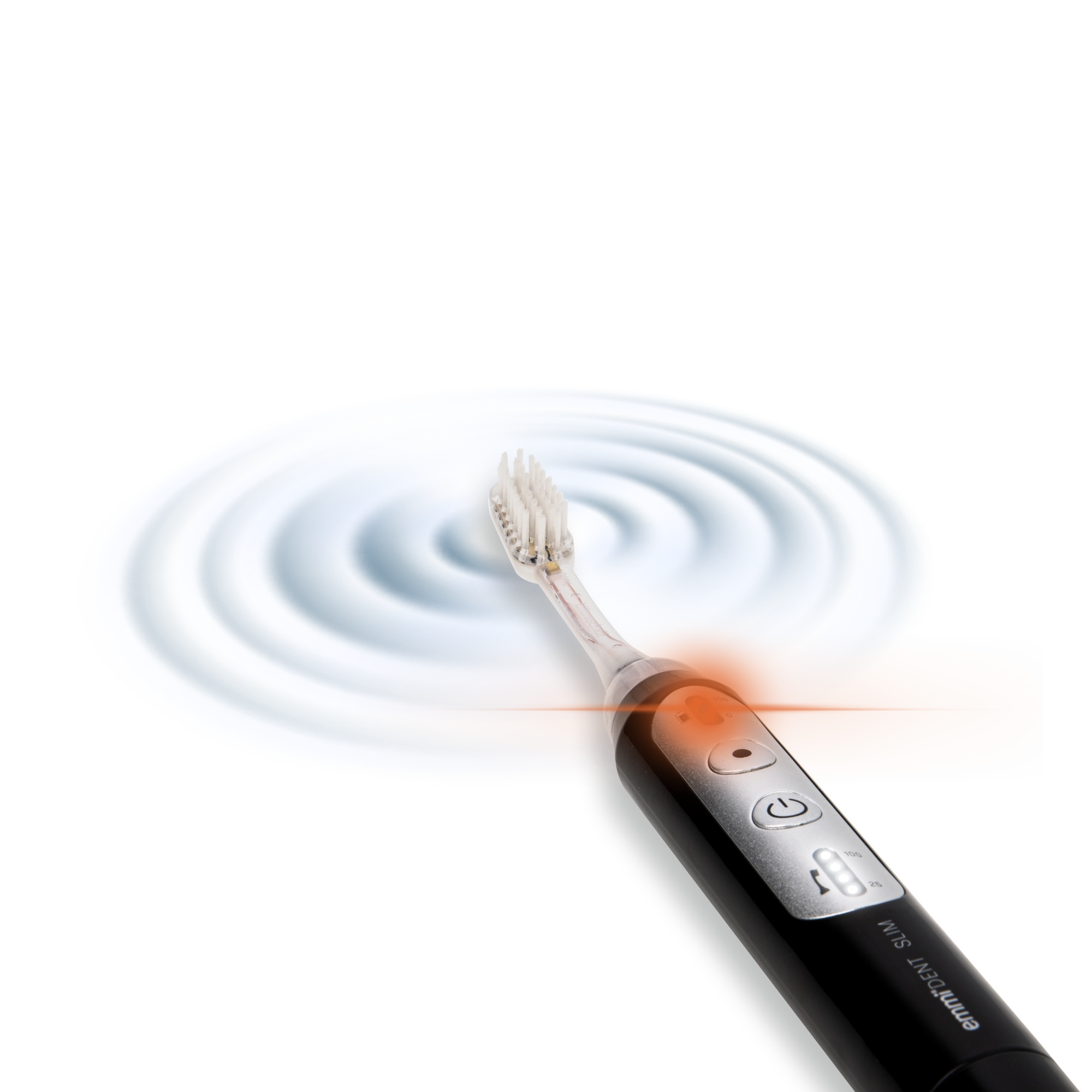 Ultrasound technology has proven itself in professional tooth cleaning at the dentist. It uses a "hard" ultrasound with a low frequency and high power. Dentists have been using the method successfully for many years to remove tartar and other contaminants. The ultrasonic toothbrush also enables daily use of ultrasonic technology at home. The innovative emmi-dent uses a "soft" ultrasound with a high frequency and low power.