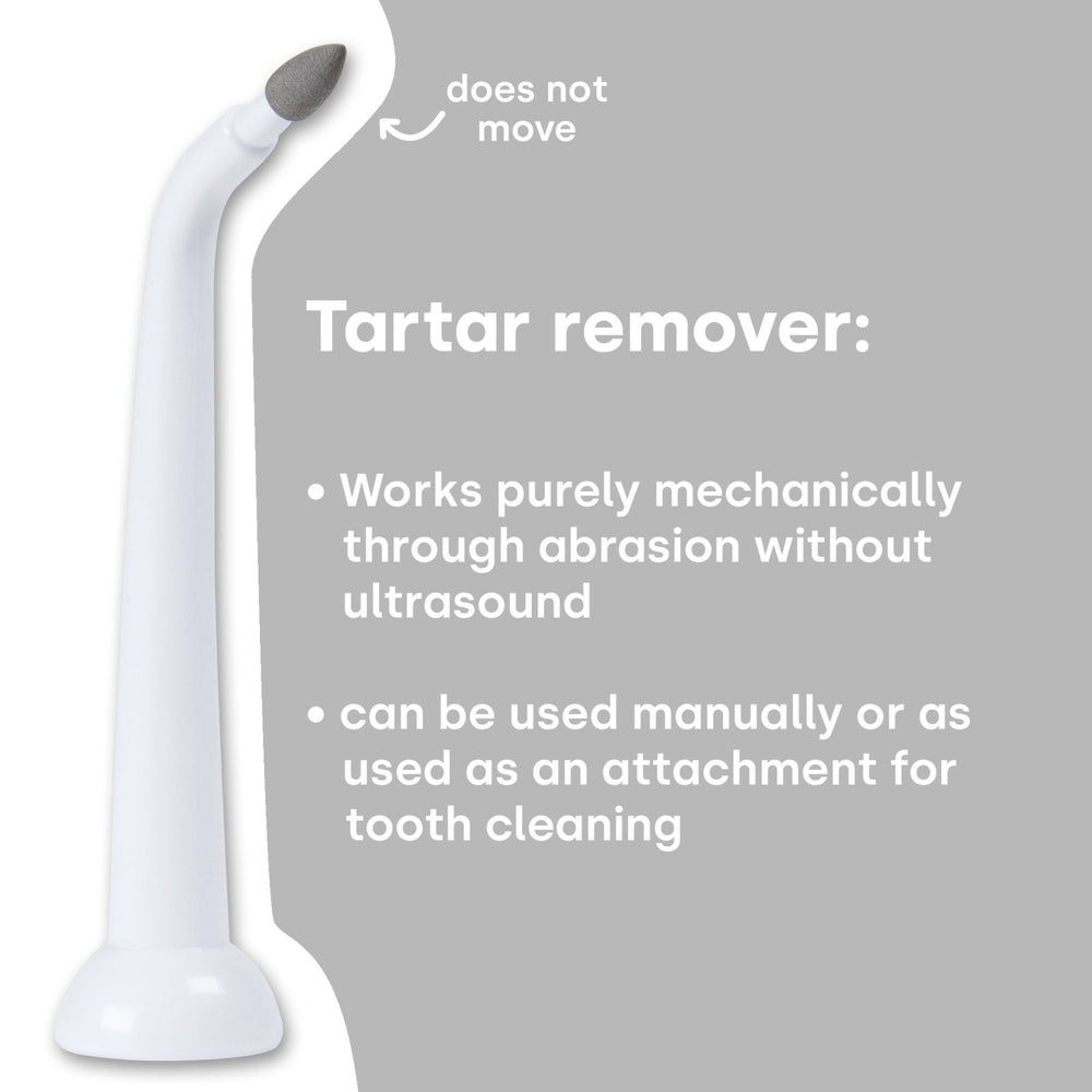 The emmi tartar remover can be used manually or as an attachment for tooth cleaning. It works purely mechanically through abrasion without ultrasound.