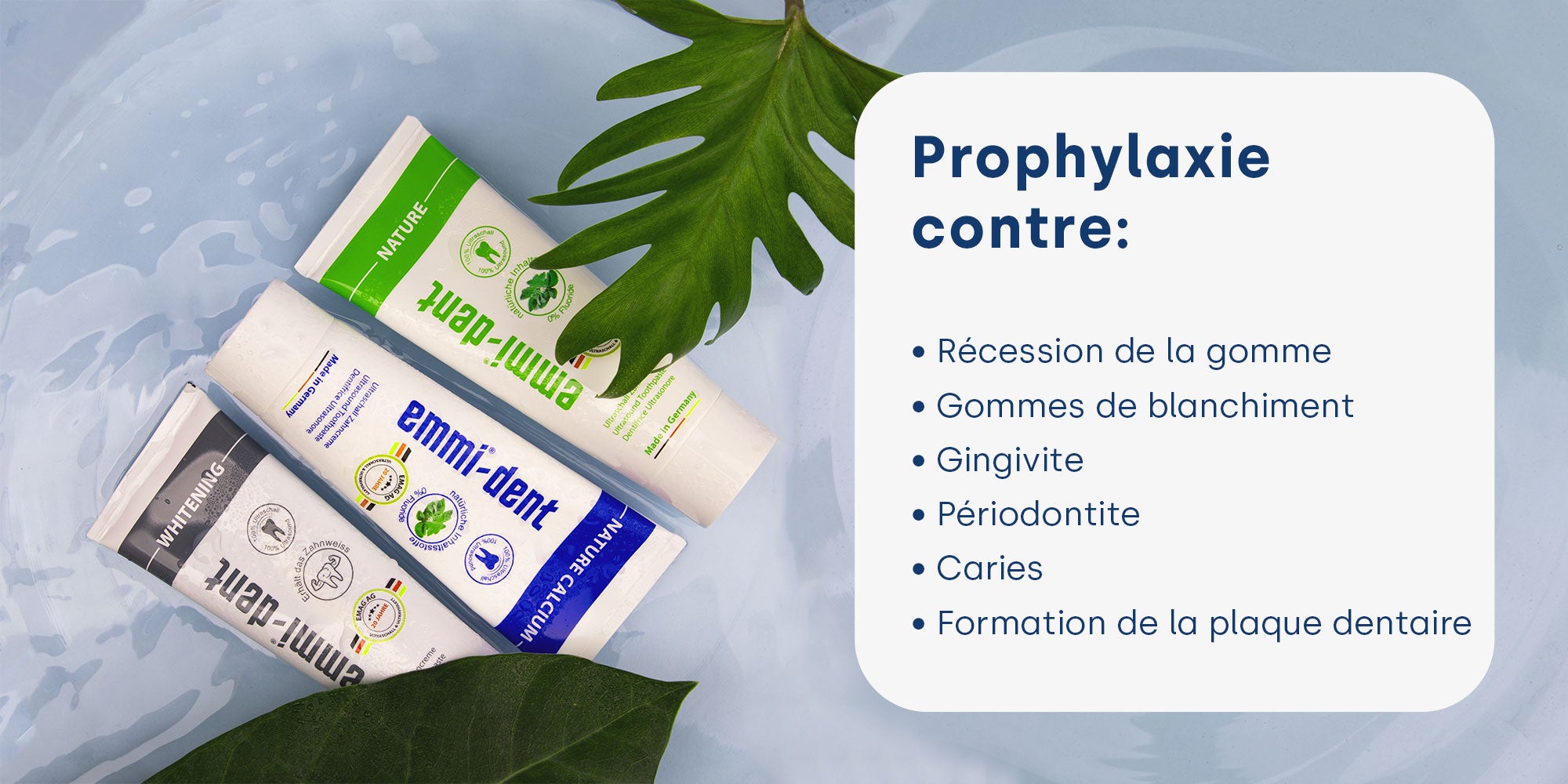 Il est important d’utiliser un dentifrice de haute qualité. Chez emmi-dent, nous sommes conscients de cette importance et proposons donc des dentifrices végétaliens soigneusement sélectionnés – avec ou sans fluor et sans aucun ingrédient douteux. Notre dentifrice est particulièrement doux pour les muqueuses et réduit efficacement la plaque dentaire, la décoloration et la mauvaise haleine.
