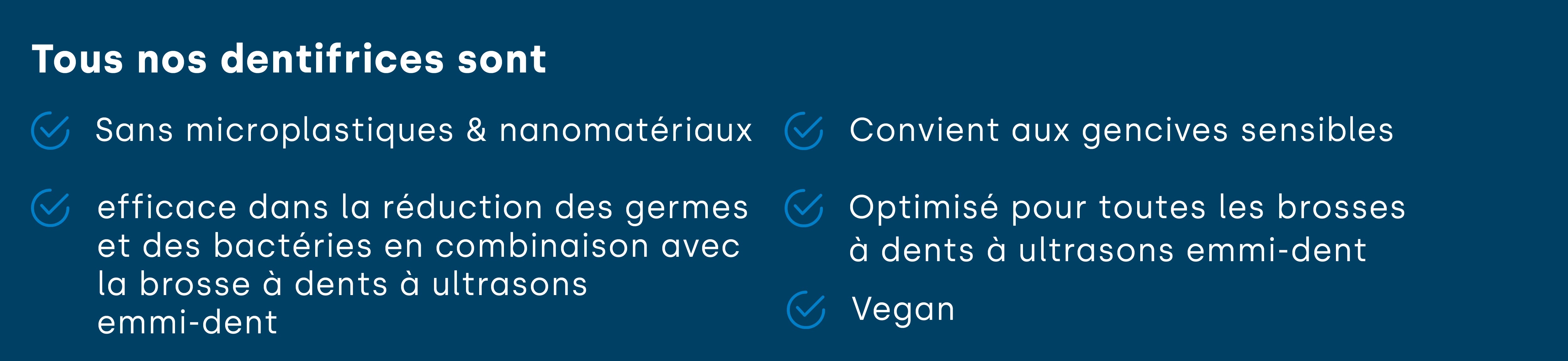 Notre brosse à dents à ultrasons fonctionne à 100 % sur la base d'une technologie ultrasonique sophistiquée et brevetée. C'est ici qu'on utilise le micro-nettoyage, qui s'effectue totalement sans mouvement et presque sans contact. Avec le nettoyage avec des brosses à dents à ultrasons, le récurage habituel appartient au passé. Le micro-nettoyage est plus efficace avec un dentifrice spécialement développé pour cette procédure. C'est pourquoi vous n'obtiendrez des résultats de soins dentaires optimaux avec la brosse à dents à ultrasons emmi-dent que si vous utilisez un dentifrice à ultrasons emmi-dent .