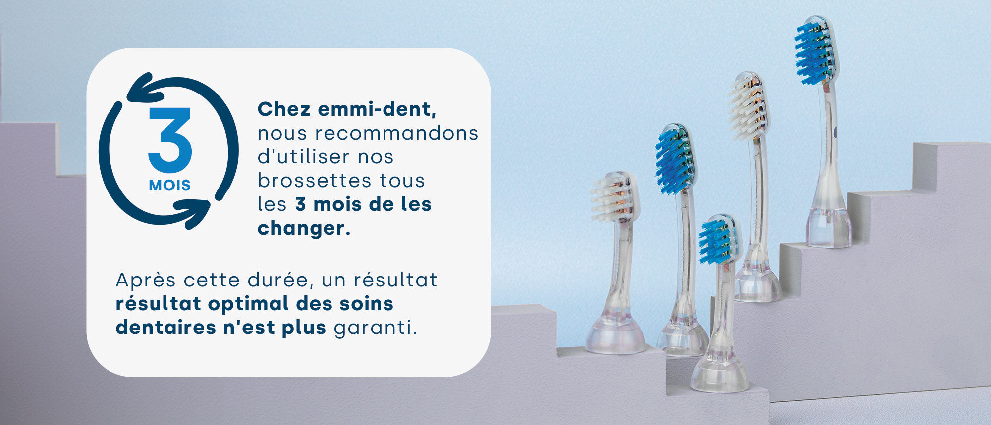 La durée de vie des têtes de brosse emmi-dent est d'environ trois mois, car une utilisation quotidienne réduit la capacité des poils à transmettre efficacement les ultrasons aux dents. Pour continuer à assurer le meilleur nettoyage des dents et une hygiène bucco-dentaire optimale, il est recommandé de changer régulièrement les têtes de brosse. Cela garantit des performances élevées et constantes de votre brosse à dents à ultrasons et protège votre santé bucco-dentaire.