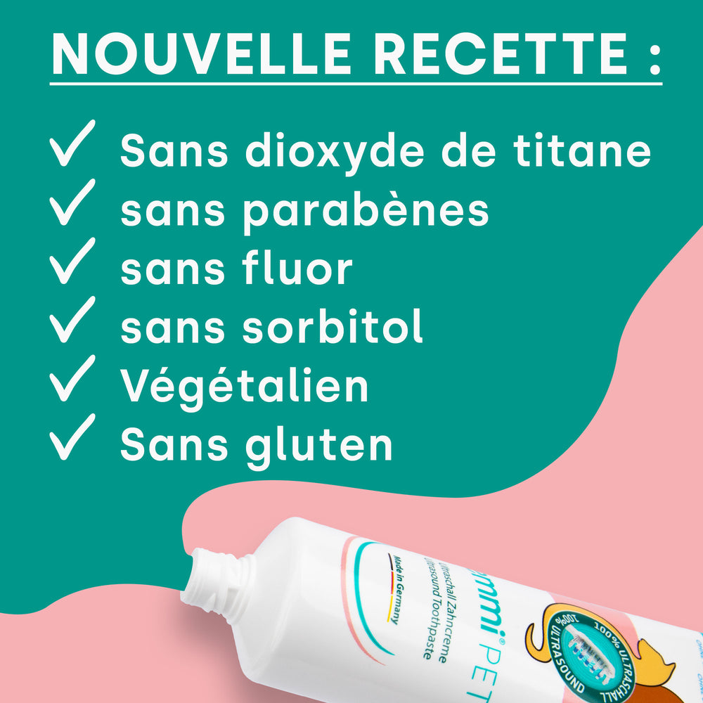 Le kit de base emmi-pet PRO contient deux têtes de brosse spécialement développées (1 x grande, 1 x petite), qui conviennent aussi bien aux petits qu'aux grands chiens. Avec le dentifrice à ultrasons emmi-pet, sans dioxyde de titane ni parabènes, les soins dentaires deviennent encore plus sûrs et plus doux.