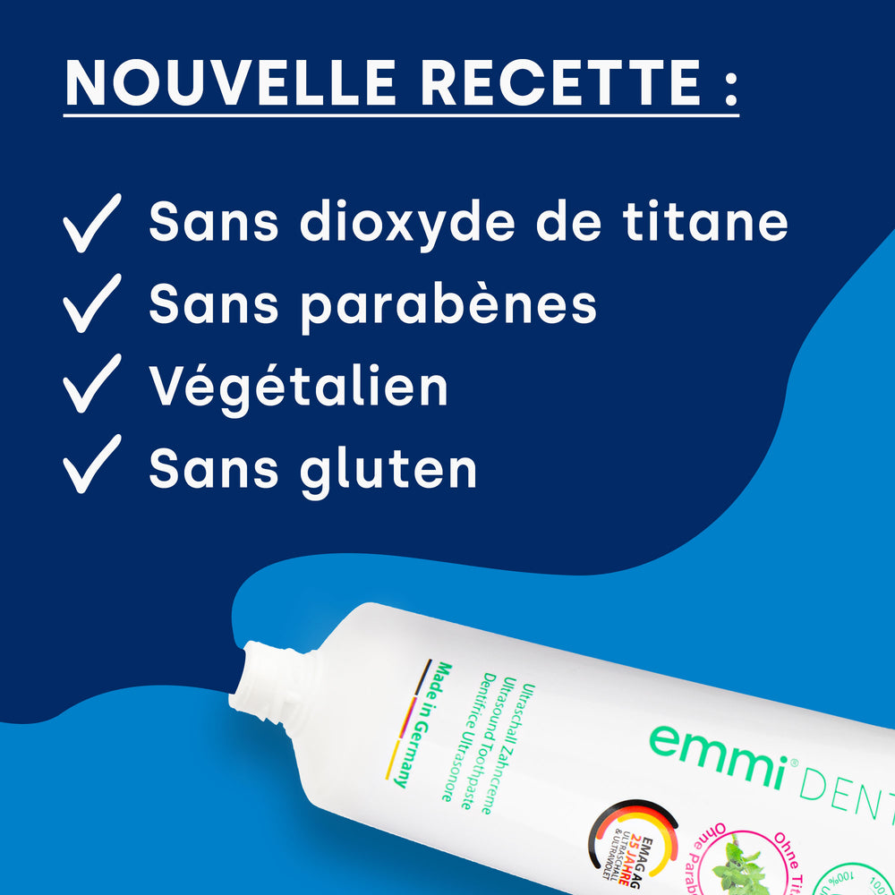 Le meilleur dentifrice sans dioxyde de titane est celui qui non seulement nettoie et protège efficacement, mais utilise également des ingrédients naturels. L’un de ces dentifrices est notre dentifrice emmi-dent Fresh. Il ne contient aucune substance nocive telle que le dioxyde de titane, les parabènes ou le gluten et est végétalien. Au lieu de cela, nous nous appuyons sur la puissance d’ingrédients naturels tels que le xylitol et la silice, connus pour leurs propriétés nourrissantes et préventives contre les caries. De plus, notre technologie innovante à ultrasons assure un nettoyage en profondeur même dans les plus petits espaces entre les dents. Cela rend vos soins dentaires non seulement plus sûrs mais également plus efficaces.