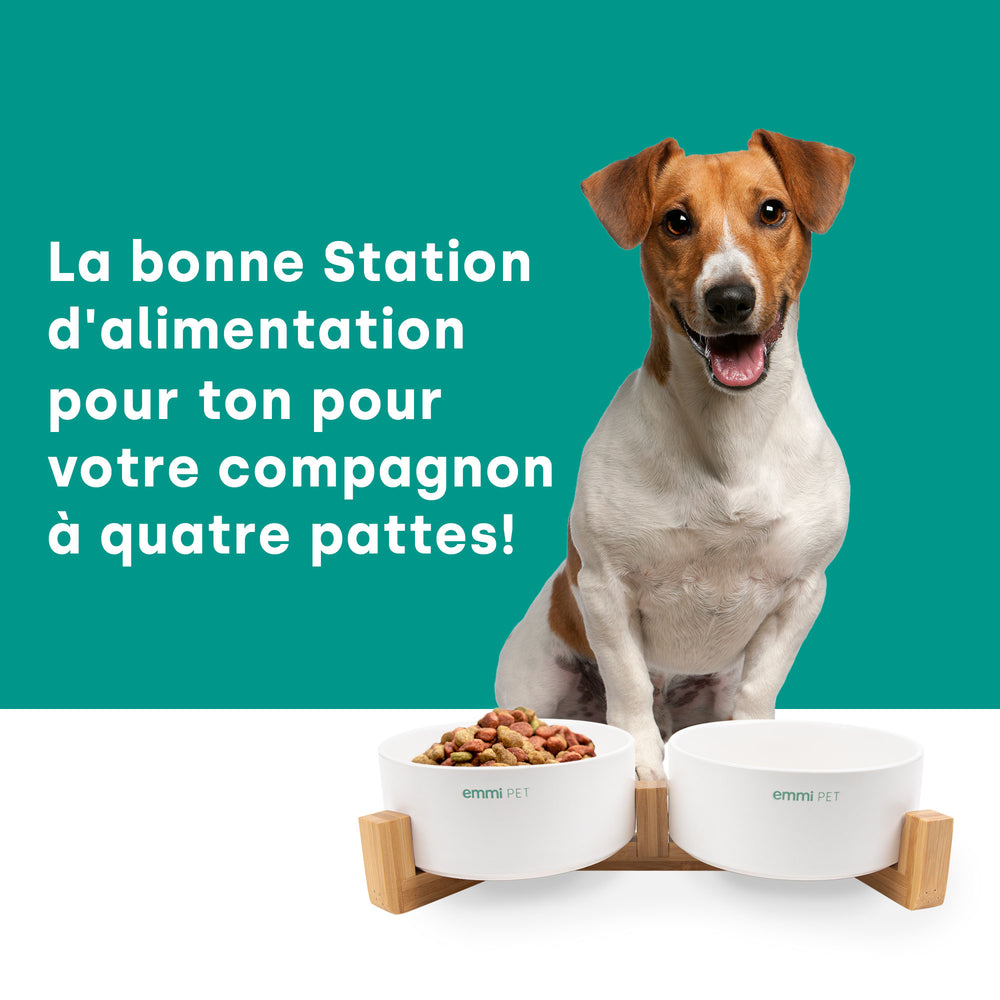 Le bol d'eau et de nourriture emmi-pet en un est fabriqué en céramique de haute qualité et offre une solution pratique et peu encombrante pour nourrir votre chien. Pour résister à une utilisation quotidienne, il est très robuste et assure une longue durée de vie. Le poids agréable des deux bols et le cadre en bois assorti assurent la stabilité et garantissent le plaisir de la ration alimentaire quotidienne. La surface lisse des gamelles pour chien facilite l'entretien et l'hygiène quotidiens. Ils peuvent être lavés à la main ou nettoyés au lave-vaisselle. Grâce à la base antidérapante, les bols en céramique restent stables sur le sol et évitent ainsi qu'ils ne se renversent. Cela minimise les déversements et garantit un environnement propre. Le cadre en bois est recouvert de vernis pour le protéger de l'eau. La barre d'alimentation pour petits et grands chiens est un accroche-regard pour chaque propriétaire d'animal grâce à son look moderne.