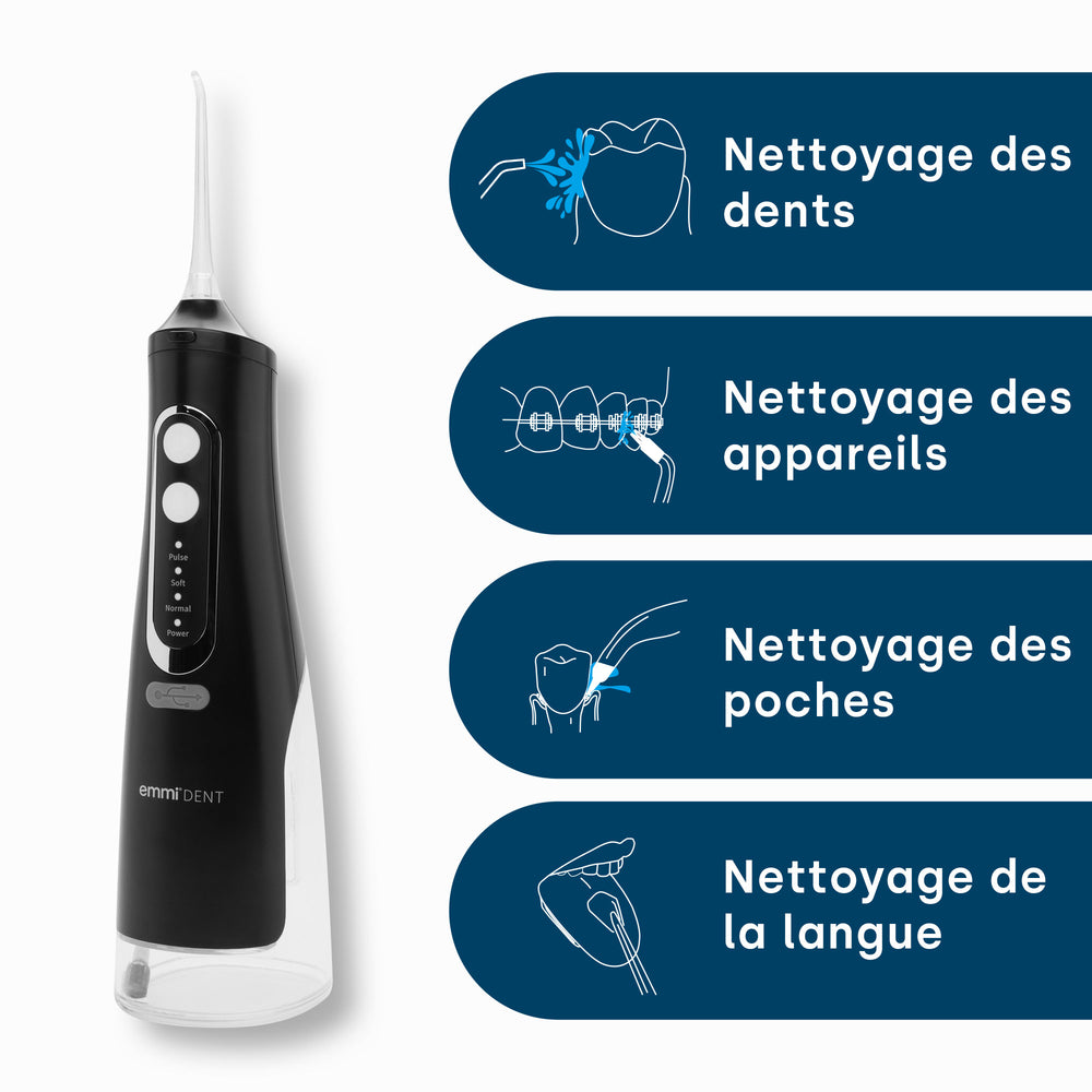 L'irrigateur buccal emmi-dent s'avère indispensable pour une hygiène bucco-dentaire complète, en complément des soins dentaires quotidiens avec une brosse à dents. Conçu pour nettoyer en profondeur et en douceur les espaces entre les dents souvent négligés lors du brossage conventionnel, il surpasse l'efficacité du fil dentaire, en particulier dans les dents serrées ou les zones difficiles d'accès. Équipé de quatre modes de nettoyage – impulsion, doux, normal et fort – ainsi que de quatre embouts de buse, l'irrigateur buccal s'adapte aux besoins individuels, bien qu'un remplacement régulier des buses tous les trois mois soit recommandé. La polyvalence de l'irrigateur buccal emmi-dent est démontrée par sa capacité non seulement à nettoyer en profondeur les résidus alimentaires et la plaque dentaire entre les dents, mais également à répondre à des besoins particuliers tels que le nettoyage autour des appareils orthodontiques et des implants. C'est un atout pour les personnes ayant des gencives sensibles en assurant un nettoyage doux mais en profondeur et prévenant ainsi les problèmes de gencives. De plus, il soutient la santé des gencives en massant, ce qui favorise la circulation sanguine, et contribue à une haleine fraîche en éliminant efficacement les bactéries de la langue. Avec sa capacité à nettoyer les poches parodontales et à lutter efficacement contre la plaque dentaire, l'irrigateur buccal emmi-dent minimise le risque de maladie des gencives et de carie dentaire, ce qui en fait un complément utile à la brosse à dents à ultrasons pour assurer une hygiène bucco-dentaire optimale.