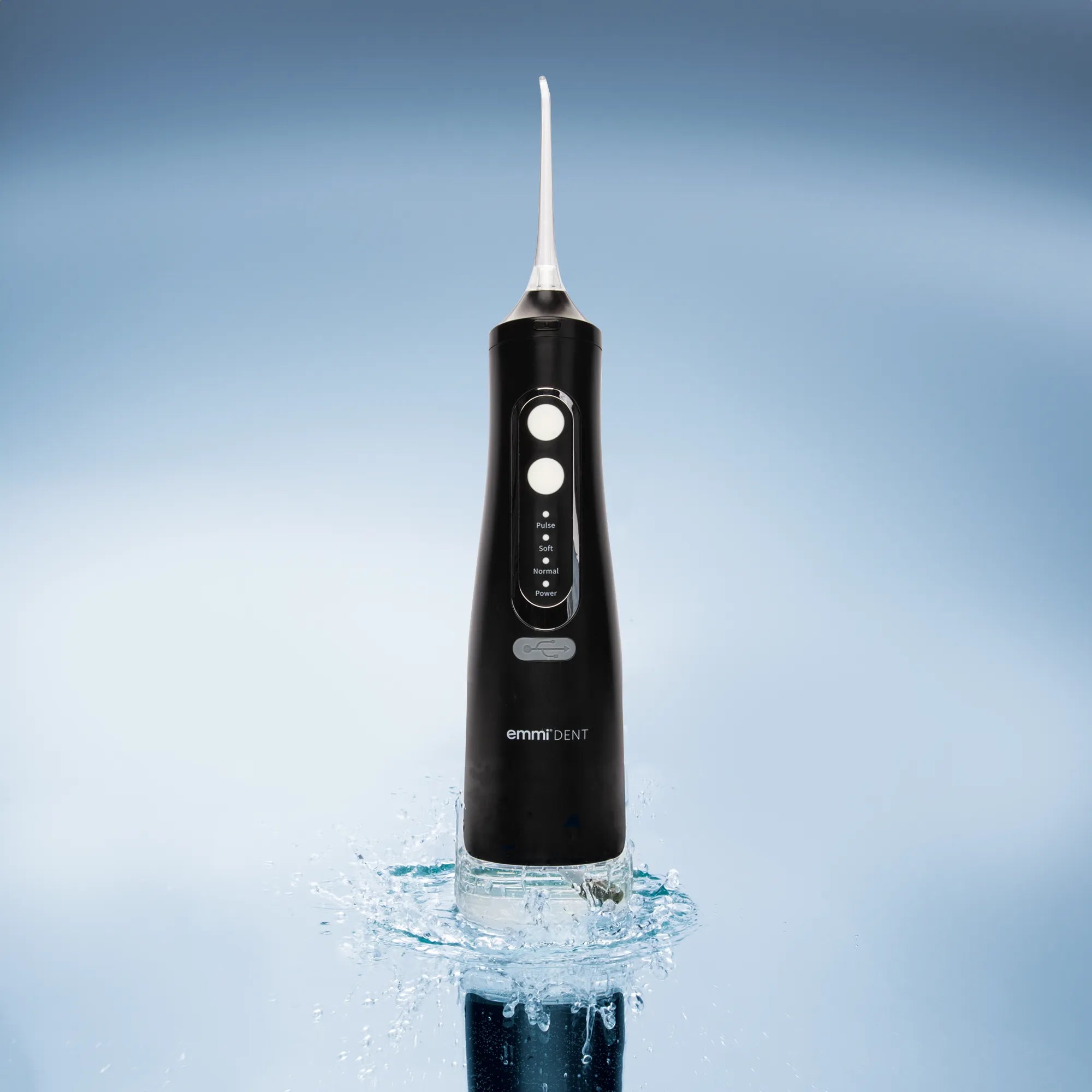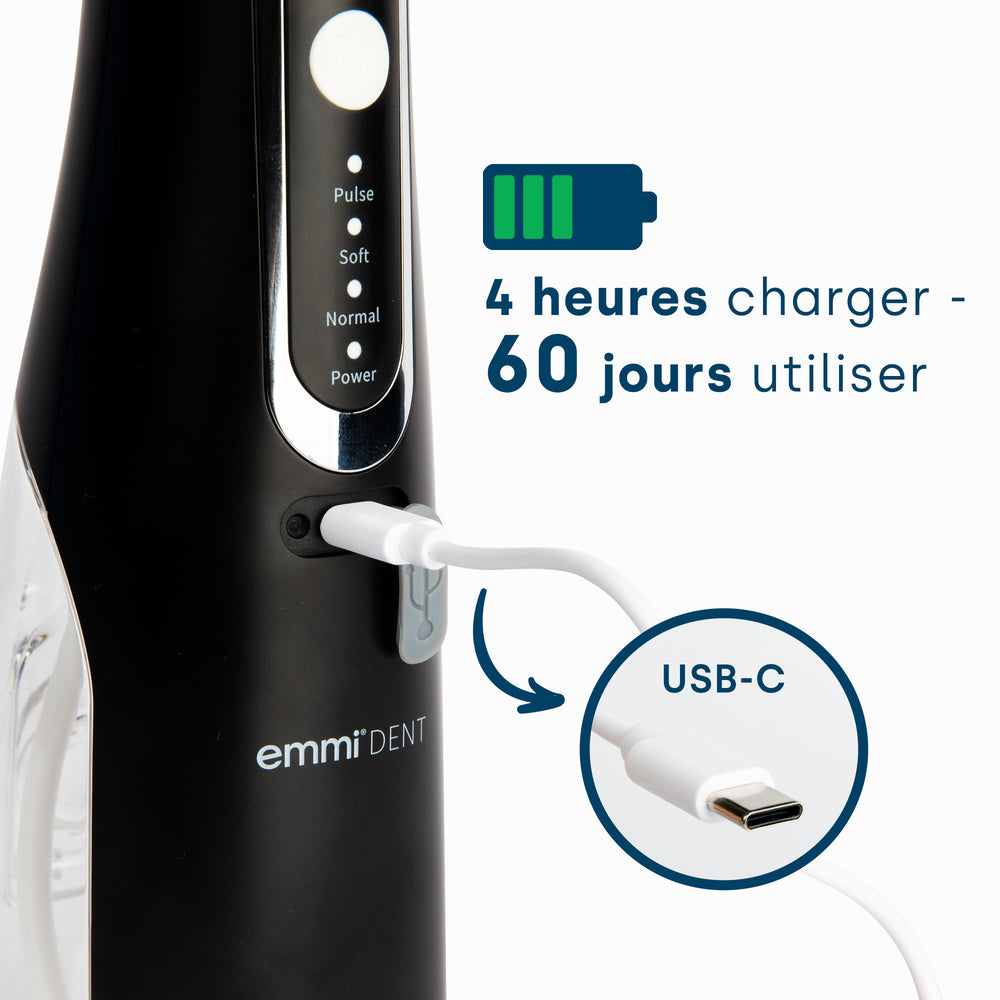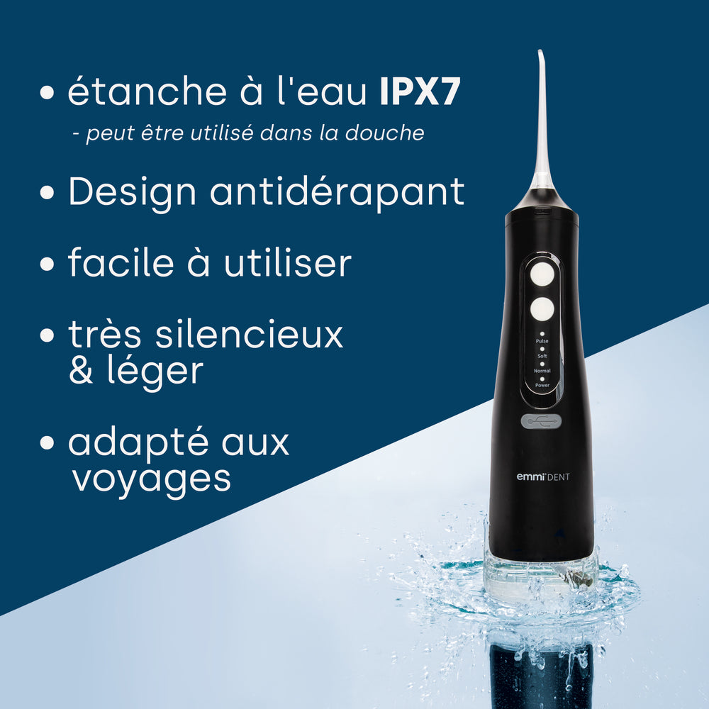 Les irrigateurs buccaux sont disponibles dans différents modèles, depuis les modèles qui se connectent directement au robinet et limitent ainsi la liberté de mouvement grâce à un tuyau d'eau, jusqu'aux irrigateurs buccaux stationnaires avec un réservoir d'eau externe, qui sont également limités dans leur manipulation. emmi-dent a reconnu ces défis et a développé une solution innovante : un irrigateur buccal pratique, simple et efficace. L'irrigateur buccal électrique emmi-dent se caractérise par sa conception sans fil, qui permet une mobilité illimitée dans toute la cavité buccale. Equipé d'un réservoir d'eau généreux et d'une batterie intégrée, il offre un confort maximal sans câbles ni tuyaux gênants. Remplissez simplement le réservoir d’eau et chargez la batterie – et l’appareil est prêt à fonctionner. De plus, l'irrigateur buccal emmi-dent est le compagnon idéal en voyage grâce à sa taille compacte. Les avantages de l'irrigateur buccal emmi-dent : - Sans fil pour une liberté de mouvement illimitée - Design compact, parfait pour les déplacements - Réservoir d'eau de 300 ml dans la pièce à main pour un remplissage facile - Chargement facile de la batterie avec USB-C (charge pendant 4 heures, utilisation pendant 60 jours) Si vous recherchez un produit qui s'adapte parfaitement à votre style de vie et à vos exigences en matière de soins dentaires soigneux, l'irrigateur buccal emmi-dent offre une solution sur mesure. Développé pour les utilisateurs qui apprécient une hygiène bucco-dentaire approfondie et détendue aussi bien en début de journée qu'en fin de soirée, il établit de nouvelles normes en matière de nettoyage des dents.