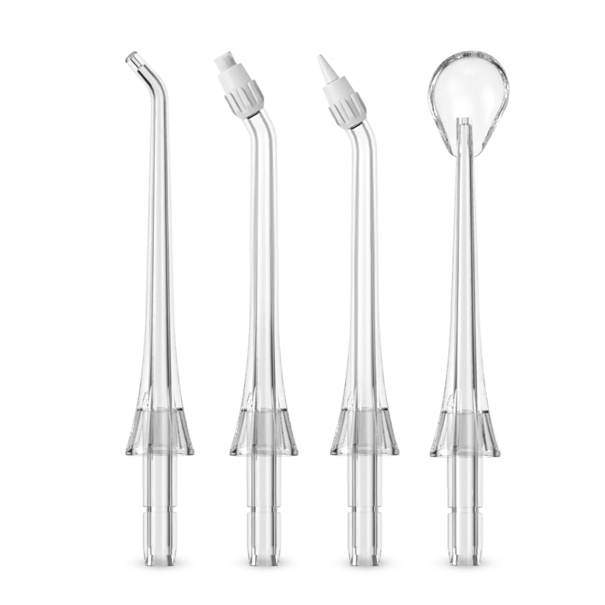 Nous avons l'embout de buse parfait pour chaque application ! Avec les quatre embouts de buse inclus, vous disposez de la buse adaptée à chaque tâche de nettoyage. Qu'il s'agisse d'appareils orthodontiques, de ponts ou d'implants, l'irrigateur buccal est idéal pour éliminer les dépôts dans les espaces entre les dents ou d'autres zones difficiles d'accès.