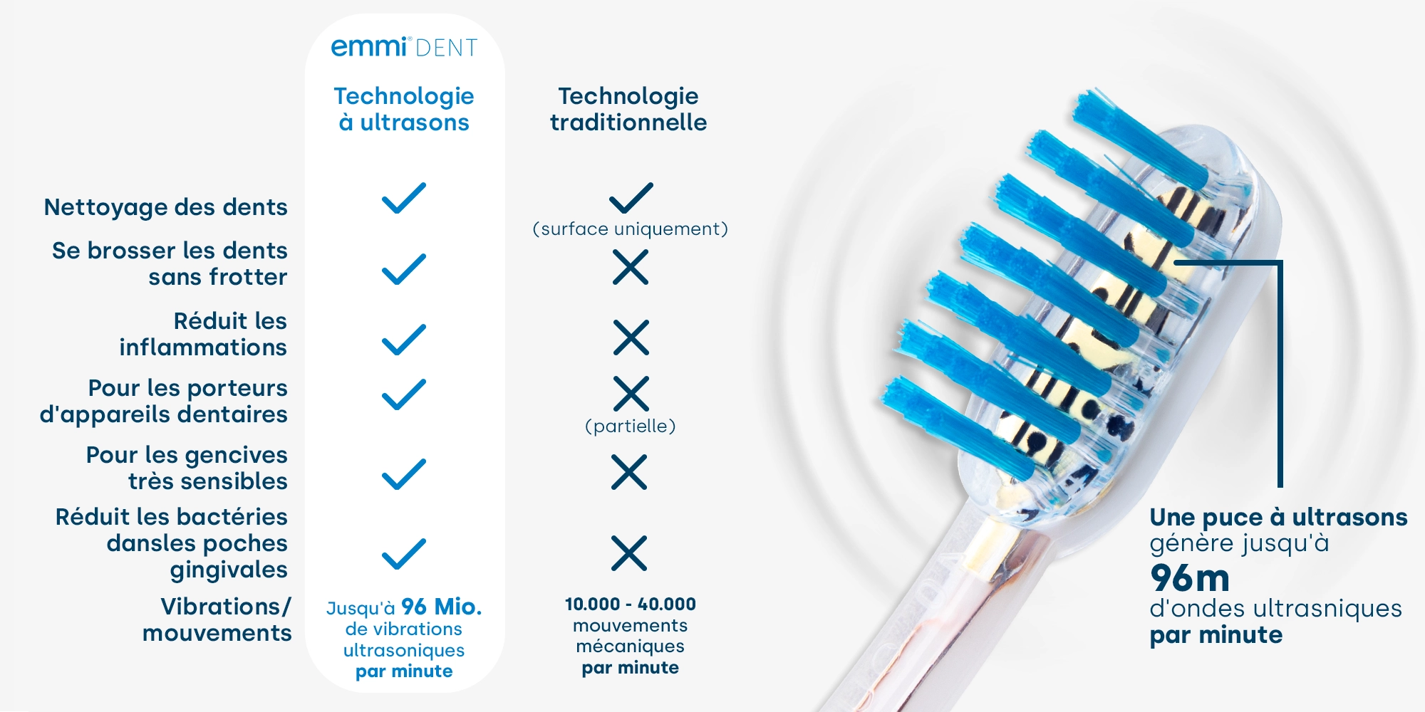 Les brosses à dents électriques comprennent les brosses à dents rotatives, les brosses à dents soniques et les brosses à dents à ultrasons. Alors que les premières ont généralement des brosses rondes qui tournent alternativement de gauche à droite, les brosses à dents soniques sont équipées de têtes allongées et vibrantes. Avec 20 000 à 40 000 vibrations par minute, elles atteignent des mouvements mécaniques nettement supérieurs à ceux des brosses rotatives. Les brosses à dents à ultrasons dépassent largement ces performances et sont également basées sur une technologie différente. Alors que les brosses à dents rotatives et soniques éliminent le biofilm à l'aide de mouvements mécaniques, l'emmi-dent fonctionne avec jusqu'à 96 millions de vibrations ultrasoniques par minute et ne nécessite aucun mouvement mécanique pour le nettoyage des dents.