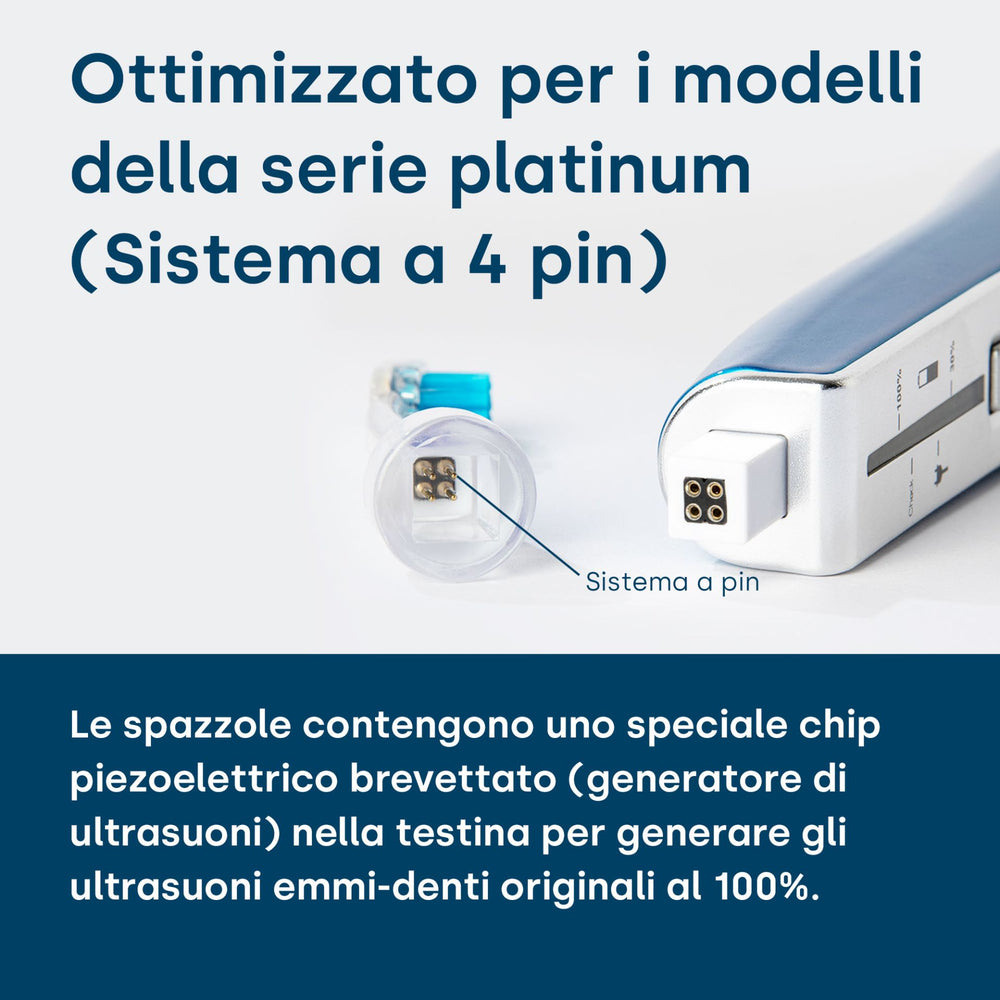 Le testine ultrasoniche degli spazzolini a ultrasuoni emmi-dent contengono uno speciale chip piezoelettrico brevettato (generatore di ultrasuoni) nella testina per generare gli ultrasuoni emmi-dent originali al 100%. Nelle basi delle testine dello spazzolino ultrasonico emmi-dent Platinum sono integrati quattro perni di contatto per il collegamento al manipolo emmi-dent Platinum. Questa innovazione impedisce che si inceppi durante l'inserimento della spina e la testina della spazzola ultrasonica può essere inserita e rimossa facilmente. Inoltre, grazie alla temporizzazione ottimizzata degli ultrasuoni, sono fino a 4 volte più efficaci delle testine metalliche Emmi-Dent .
