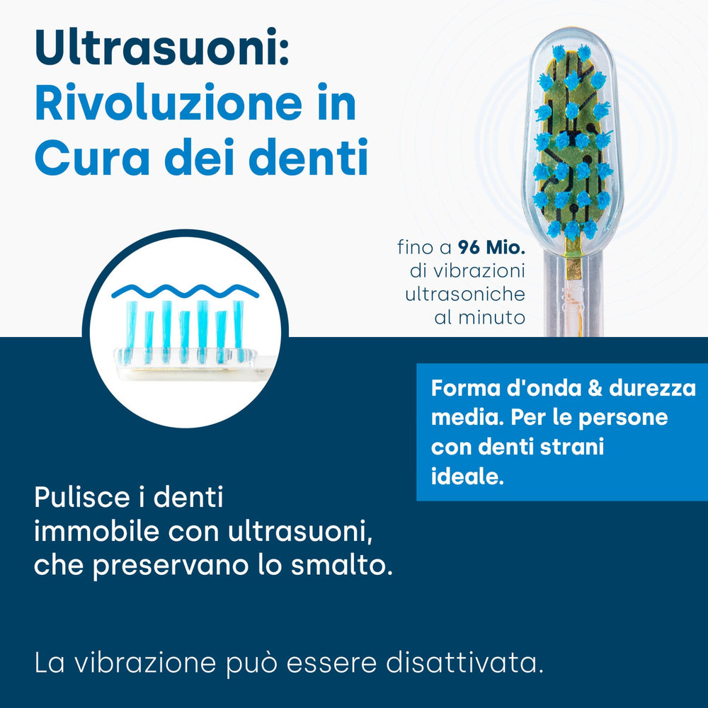 Le testine degli spazzolini ultrasonici devono essere sostituite al massimo dopo 3 mesi di utilizzo. Dopo questo periodo, la capacità delle setole di trasmettere il 100% degli ultrasuoni si indebolisce e non è più garantita una pulizia ottimale dei denti e un'igiene orale.