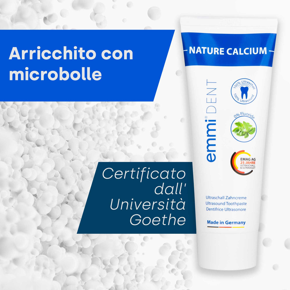 Non perdere l'occasione di provare il dentifricio ultrasonico emmi-dent Nature Calcium e rinforzare i tuoi denti in modo naturale. Ordina oggi e goditi i vantaggi di cure odontoiatriche di alta qualità, senza fluoro, ma con il potere del calcio.
