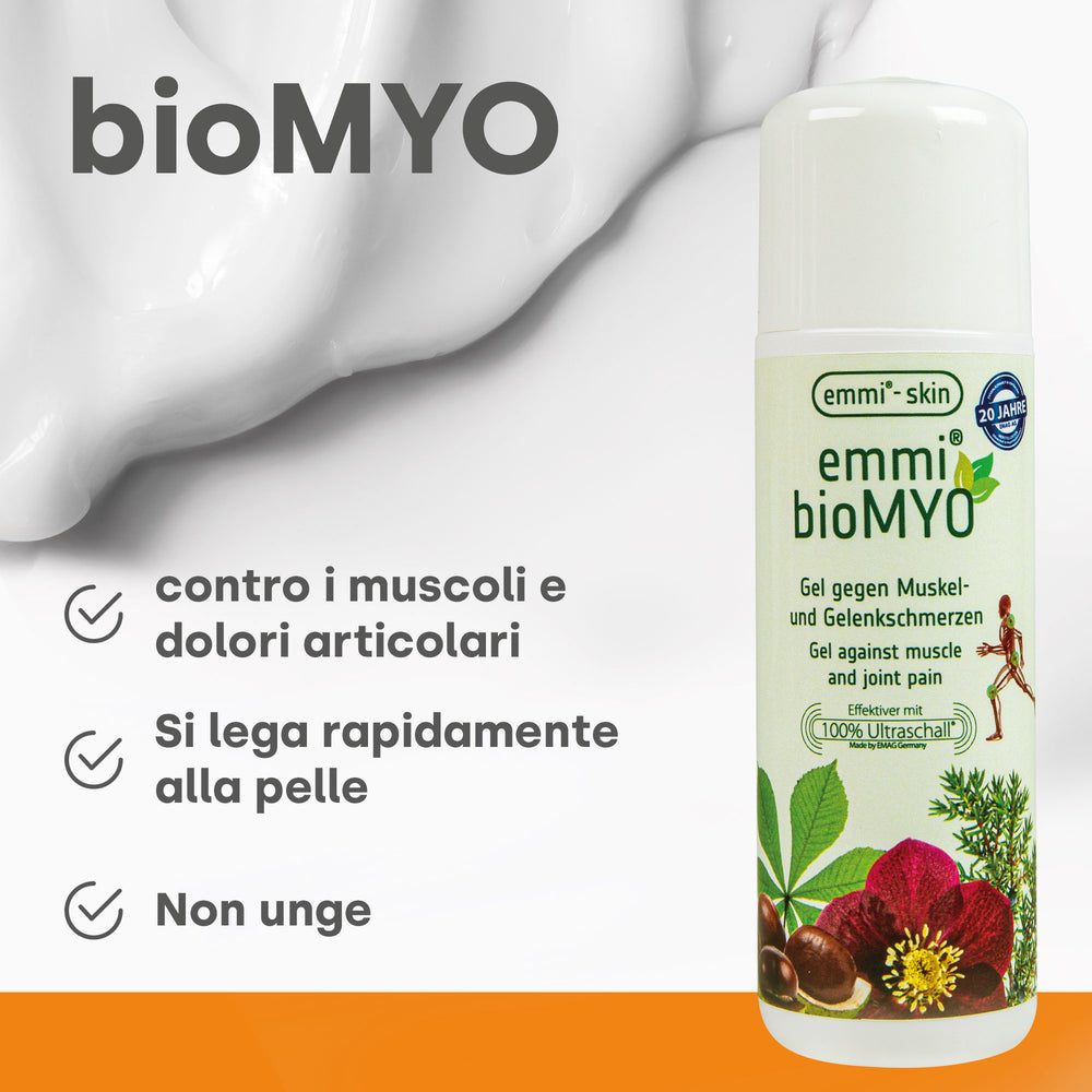 emmi-skin bioMYO è un gel contro i dolori muscolari e articolari, agisce come termoterapia per i dolori articolari e muscolari. Inoltre, le nostre creme ottimizzate per ultrasuoni e la schiuma termica della nostra azienda sono state testate dermatologicamente e hanno ricevuto la valutazione "molto buono"!