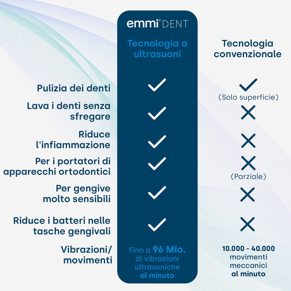 La tecnologia ad ultrasuoni ha dimostrato di essere efficace nella pulizia professionale dei denti presso il dentista. Si utilizza un ultrasuono “duro”, ovvero a bassa frequenza e ad alta potenza. Da molti anni i dentisti utilizzano con successo questo metodo per rimuovere il tartaro e altri contaminanti. Lo spazzolino ultrasonico consente anche l'uso quotidiano della tecnologia a ultrasuoni a casa. L’innovativo emmi-dent utilizza un ultrasuono “soft” ad alta frequenza e bassa potenza.