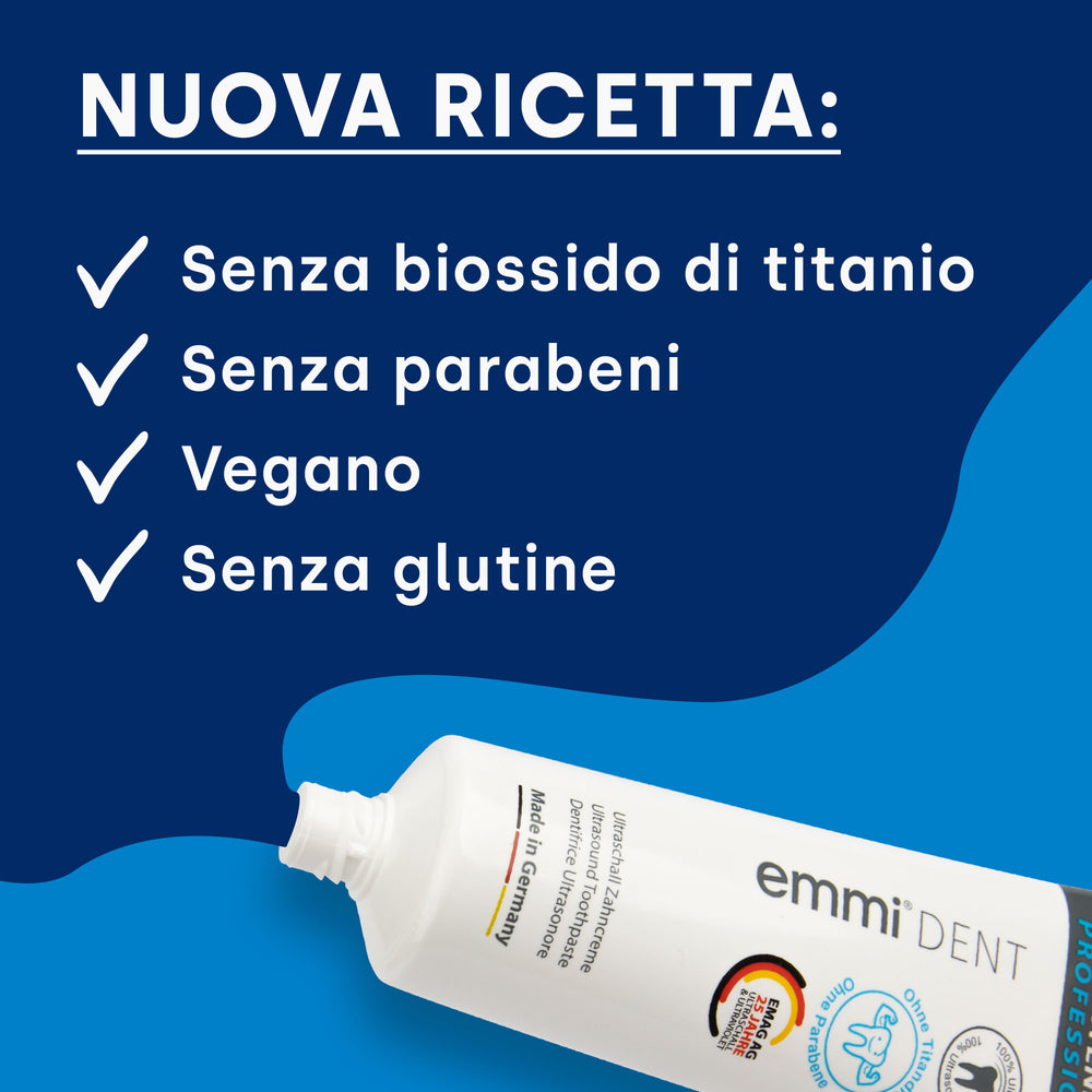 Scopri il mondo migliorato del dentifricio sbiancante emmi-dent : ora senza biossido di titanio e parabeni! Sperimenta lo stesso potente effetto sbiancante, ma con una formula ancora più naturale. L'assenza di biossido di titanio rende il nostro dentifricio delicato e delicato, perfetto per denti bianchi e splendenti senza compromessi. Godetevi il meglio della cura dentale naturale e un sorriso radioso!