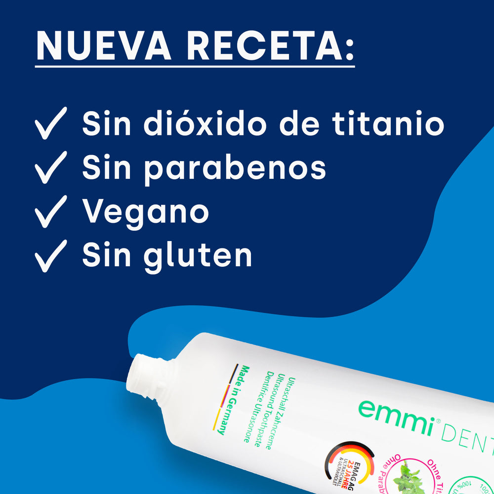 La mejor pasta de dientes sin dióxido de titanio es aquella que no sólo limpia y protege eficazmente, sino que también utiliza ingredientes naturales. Una de estas pastas de dientes es nuestra pasta de dientes emmi-dent Fresh. No contiene sustancias nocivas como dióxido de titanio, parabenos o gluten y es vegano. En su lugar, confiamos en el poder de ingredientes naturales como el xilitol y el sílice, conocidos por sus propiedades nutritivas y preventivas de las caries. Además, nuestra innovadora tecnología de ultrasonidos garantiza una limpieza profunda incluso en los espacios más pequeños entre los dientes. Esto hace que su cuidado dental no sólo sea más seguro sino también más efectivo.