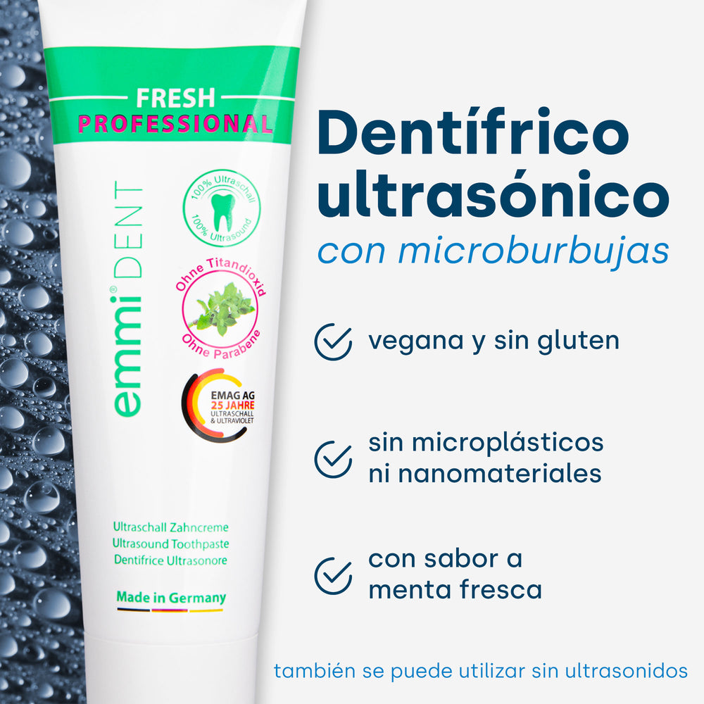 La pasta de dientes emmi-dent Fresh es ideal para dientes sensibles. Limpia suavemente, fortalece las encías y combate la placa y el sarro. Con ingredientes naturales, proporciona un aliento fresco y una sensación de limpieza a través de la revolucionaria tecnología de ultrasonido.