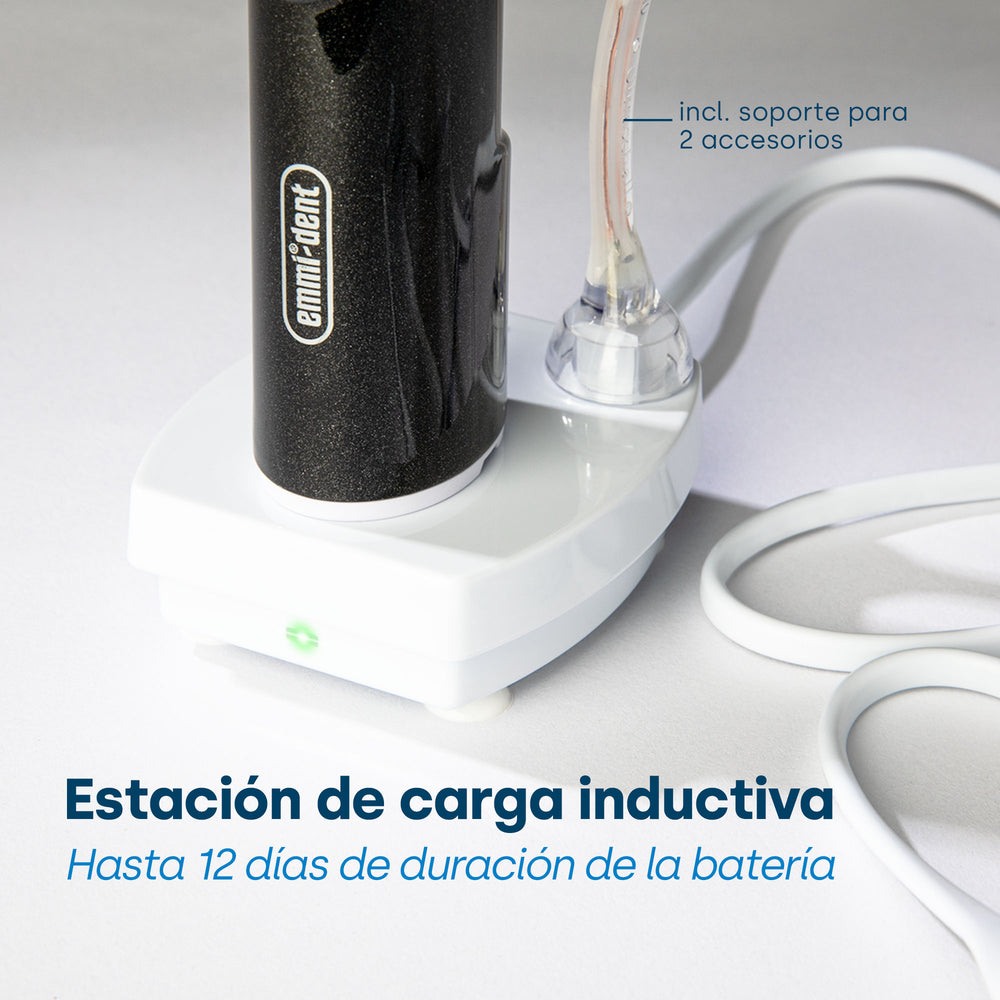 El emmi-dent Metallic tiene una duración de batería óptima. Con un uso regular de 2 a 3 veces al día, el Metallic puede durar hasta 12 días antes de necesitar recargarse. Esta batería de larga duración (iones de litio) ofrece comodidad y uso ininterrumpido y elimina la necesidad de cargas frecuentes.
