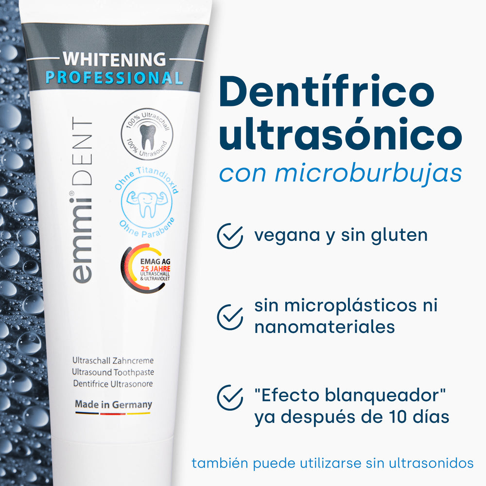 La tecnología de ultrasonidos ha demostrado ser eficaz en la limpieza dental profesional en el dentista. Se utiliza un ultrasonido “duro”, que tiene una frecuencia baja y una potencia alta. Los dentistas han utilizado este método con éxito durante muchos años para eliminar el sarro y otros contaminantes. El cepillo de dientes ultrasónico también permite el uso diario de la tecnología ultrasónica en casa. El innovador emmi-dent utiliza un ultrasonido “suave” de alta frecuencia y baja potencia.