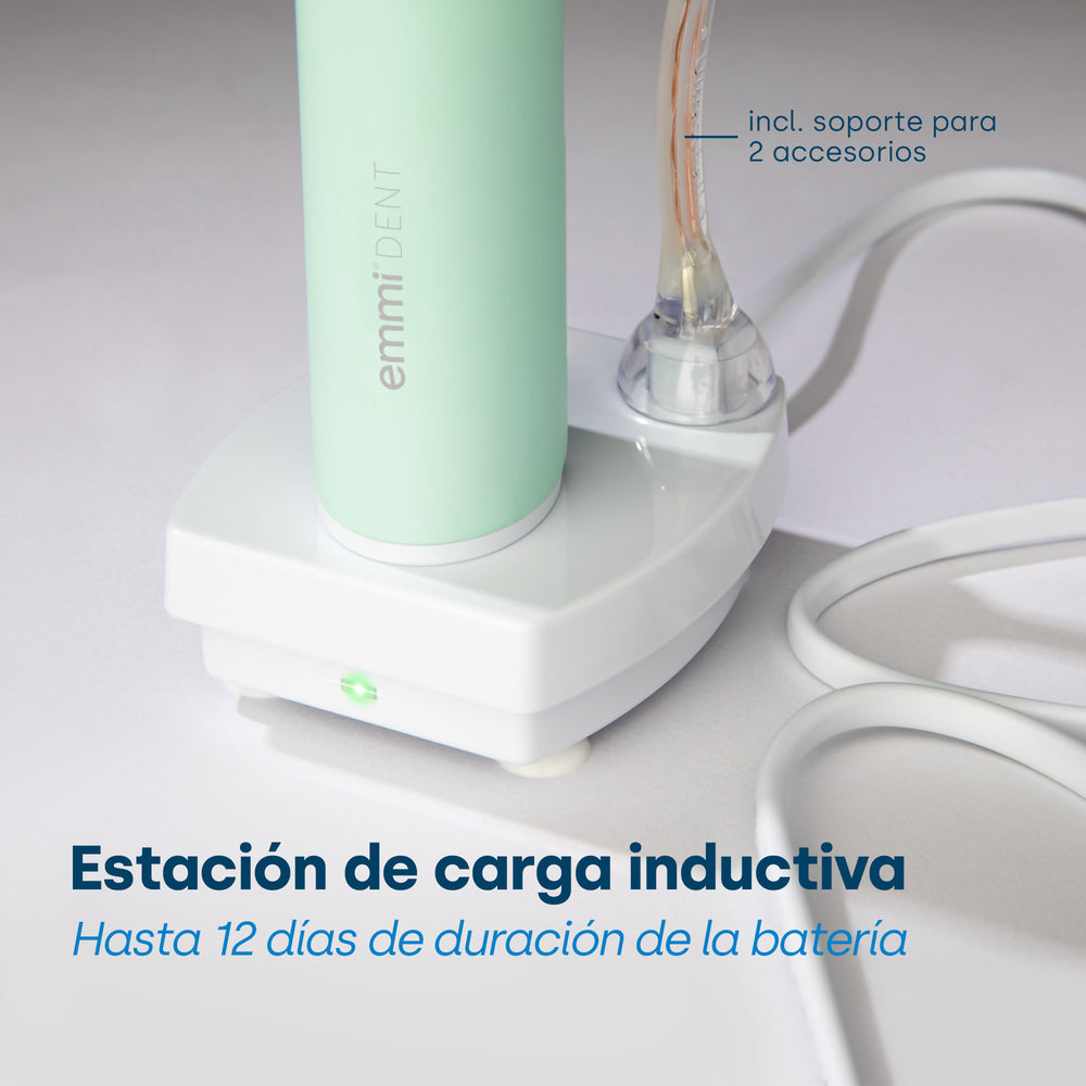 El emmi-dent Metallic tiene una duración de batería óptima. Con un uso regular de 2 a 3 veces al día, el Metallic puede durar hasta 12 días antes de necesitar recargarse. Esta batería de larga duración (iones de litio) ofrece comodidad y uso ininterrumpido y elimina la necesidad de cargas frecuentes.