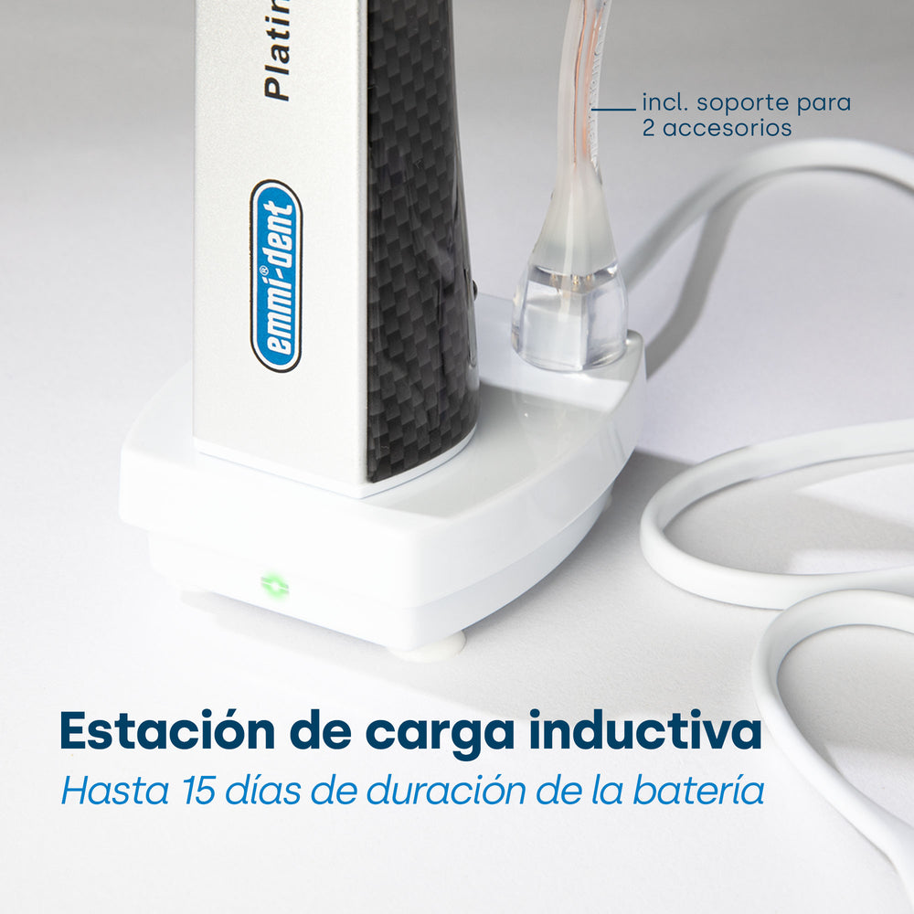 El emmi-dent Platinum tiene una batería de mayor duración que sus modelos predecesores. Con un uso regular de 2 a 3 veces al día, el Platinum puede durar hasta 15 días antes de necesitar recargarse. Esta batería de larga duración (iones de litio) ofrece comodidad y uso ininterrumpido y elimina la necesidad de cargas frecuentes.