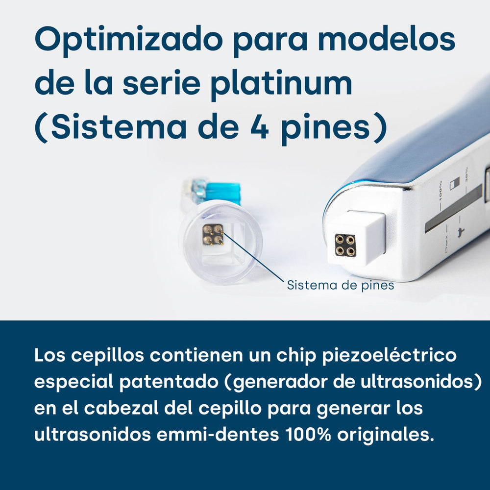 Los modelos Platinum utilizan una sincronización optimizada a través de la integración de un sistema de 4 pines. Esta mejora hace que la tecnología de ultrasonidos sea mucho más efectiva en comparación con los modelos emmi-dent Metallic y Go. La sincronización mejorada permite una acción de limpieza más eficiente y potente, garantizando una eliminación completa de la placa y una buena higiene bucal.