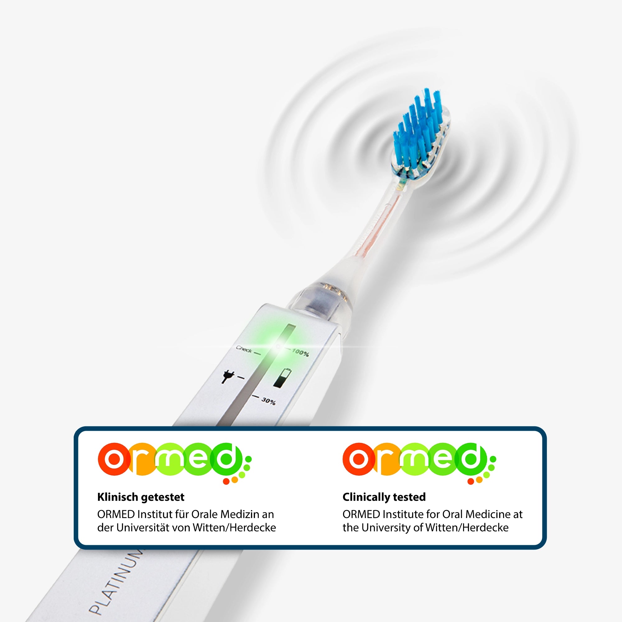 El emmi-dent Platinum utiliza tecnología avanzada de 4 pines que funciona con cuatro pulsos por segundo. El resultado es una limpieza mucho más eficaz que con los cepillos de dientes convencionales, generando hasta 96 millones de vibraciones ultrasónicas por minuto. Esta tecnología garantiza una limpieza profunda que puede incluso reducir la inflamación en la boca, un resultado confirmado por estudios.