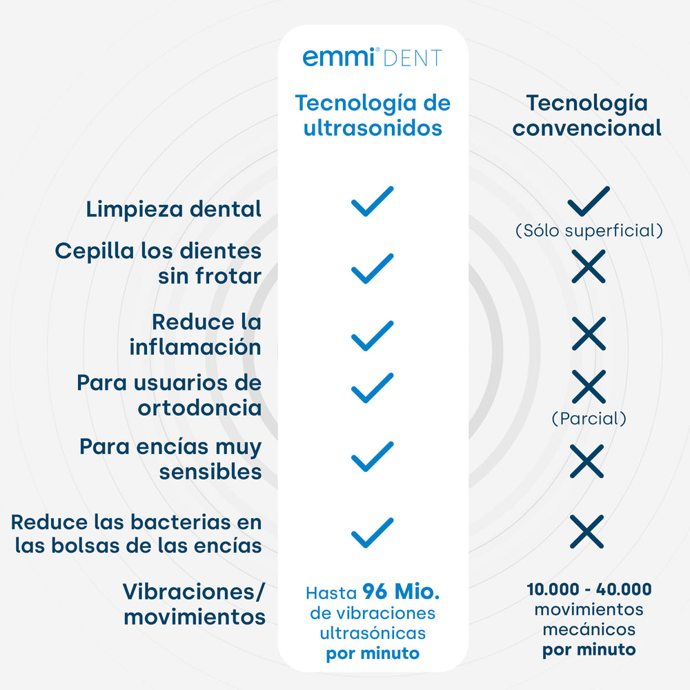 La diferencia crucial con otros cepillos de dientes radica en el tipo de limpieza: mientras que los cepillos de dientes eléctricos rotatorios y sónicos funcionan mecánicamente y, por lo tanto, solo limpian las áreas que alcanzan físicamente, el cepillo de dientes ultrasónico de emmi-dent ofrece una limpieza integral de toda la cavidad bucal. Y esto se hace sin ninguna presión, lo que permite un cuidado suave y minucioso, respetuoso con las encías y adecuado para dientes sensibles.