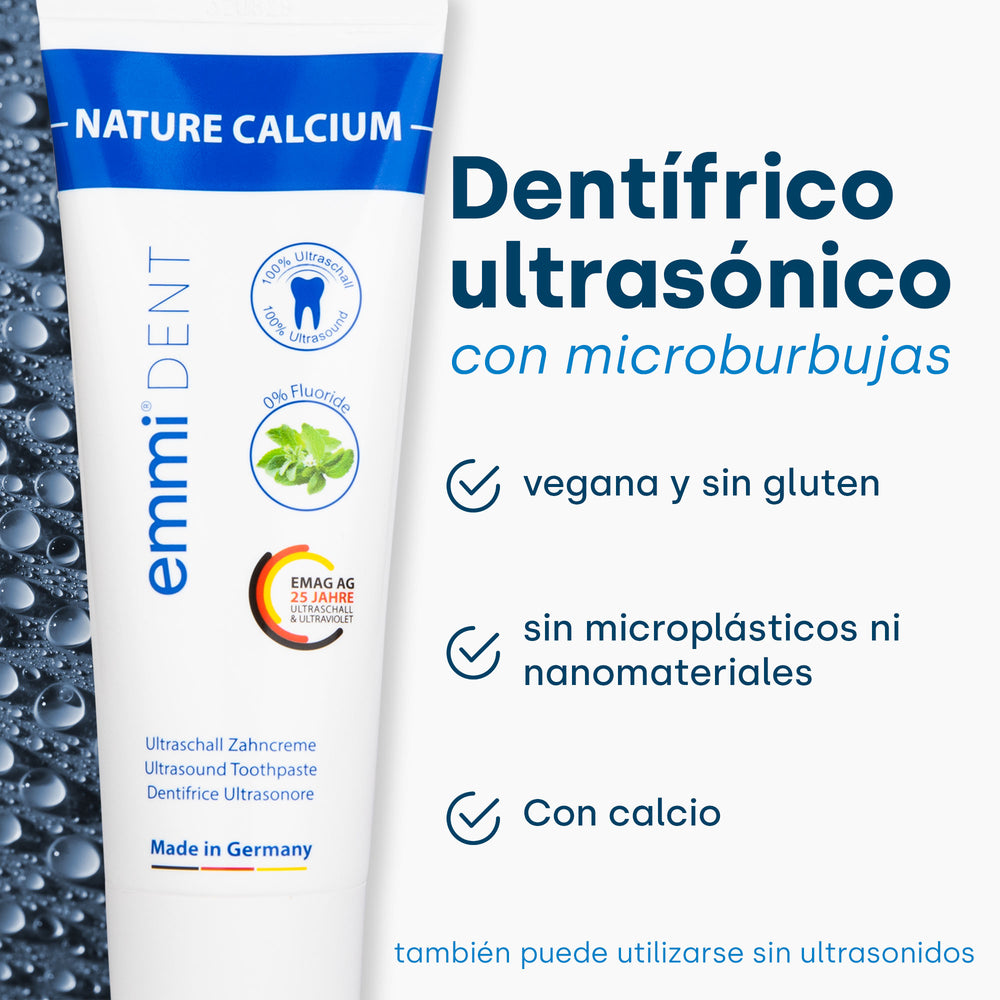 La pasta de dientes emmi-dent Nature Calcium está enriquecida con calcio y no contiene flúor. La pasta de dientes contiene un suave sabor a mentol que proporciona una frescura sutil al cepillarse los dientes. El calcio que contiene ayuda a fortalecer el esmalte dental y promueve la salud bucal general y la vitalidad.