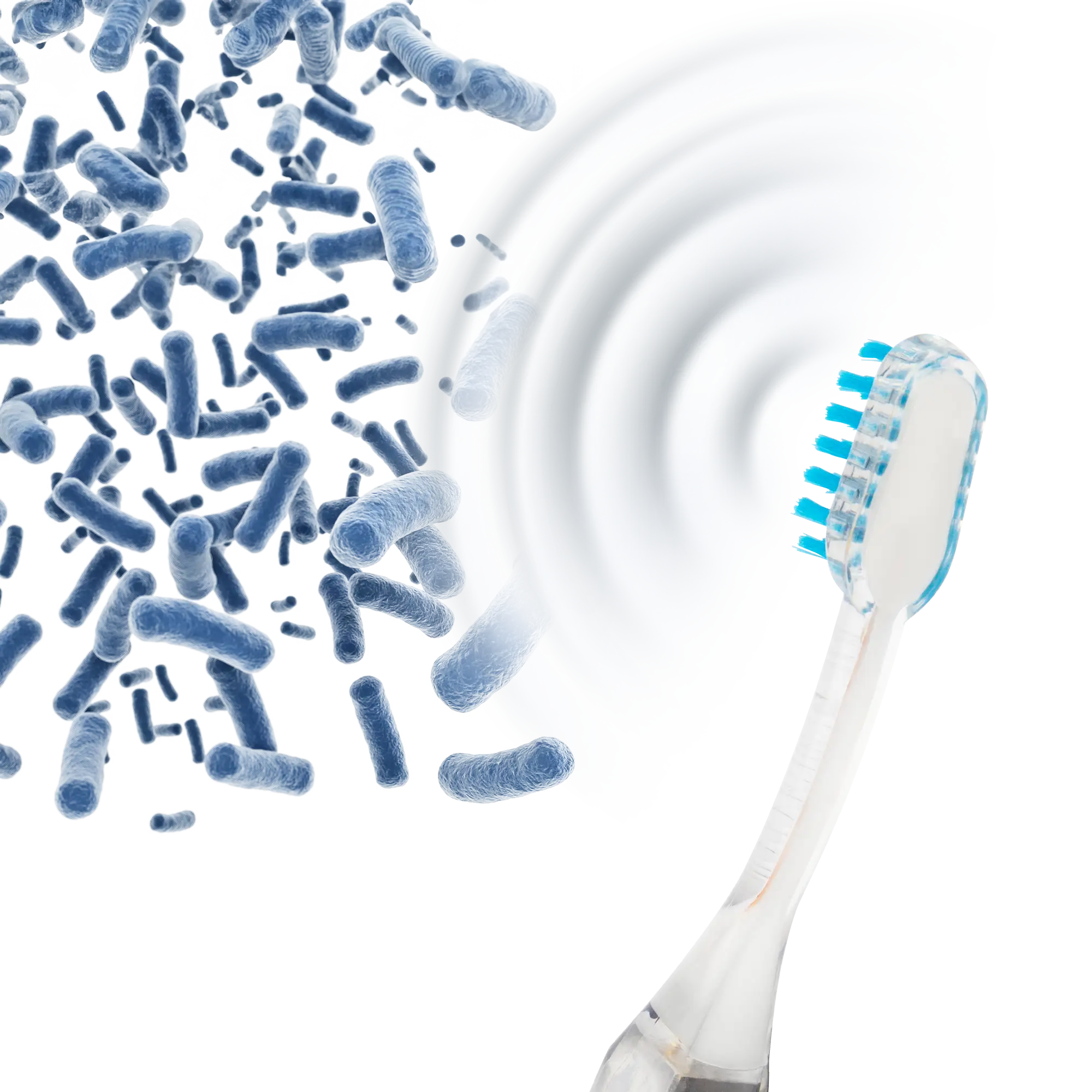 El cuidado dental con cepillos de dientes convencionales se limita a las zonas de la boca que alcanza el cepillo rotatorio o sónico. A diferencia de los cepillos de dientes eléctricos convencionales, el cepillo de dientes ultrasónico funciona completamente sin presión transmitiendo vibraciones. Esto significa que toda la cavidad bucal queda limpia a fondo.