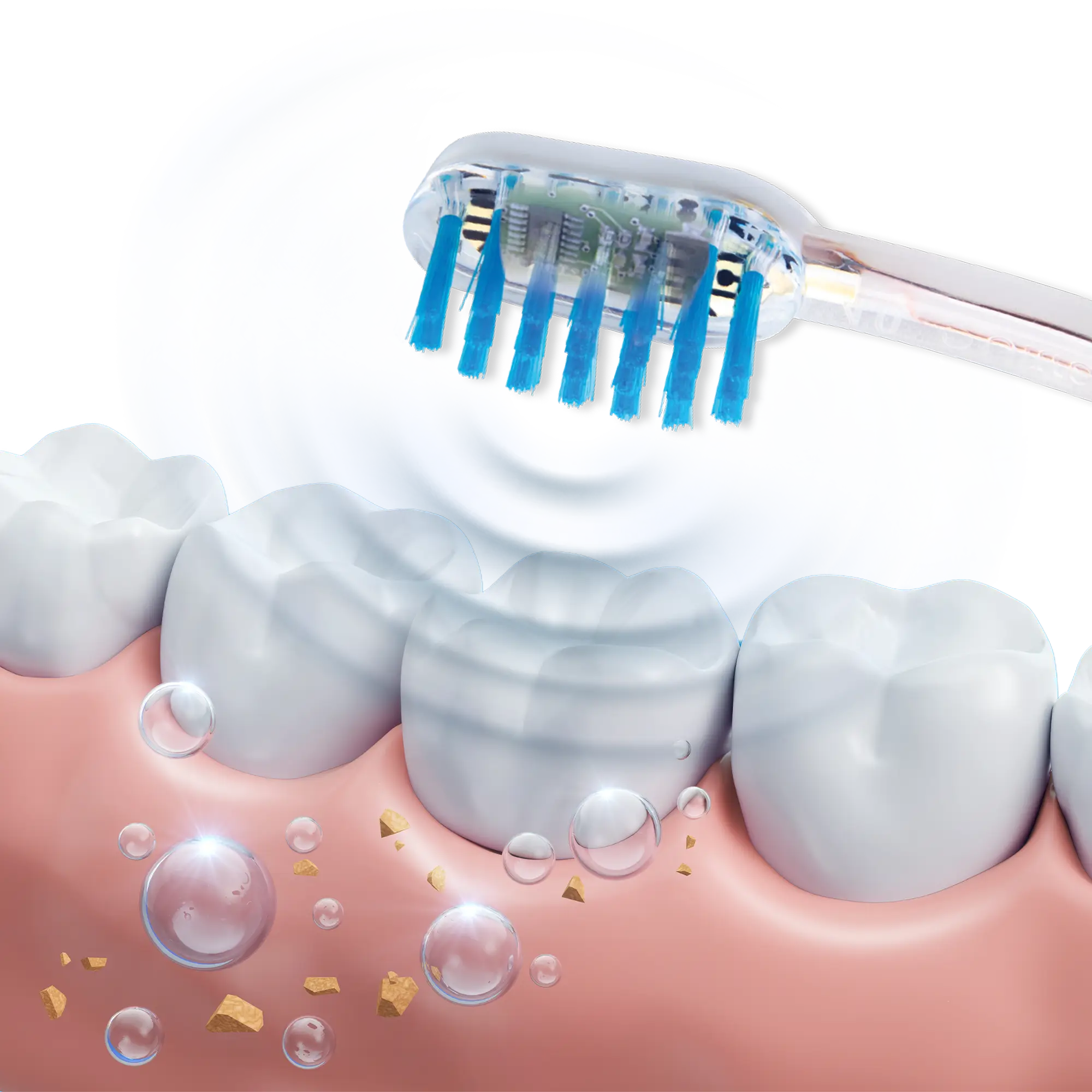 Las finas vibraciones ultrasónicas penetran profundamente en los espacios entre los dientes y las encías, eliminando bacterias incluso en lugares de difícil acceso y previniendo así eficazmente la caries, la placa y la gingivitis. El uso regular puede reducir activamente el desarrollo de gingivitis y periodontitis.
