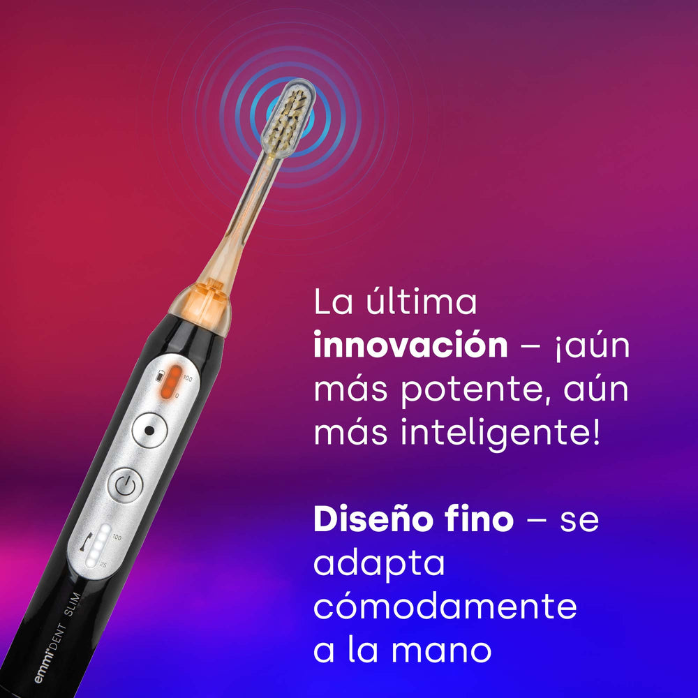 El emmi-dent Slim limpia tus dientes con ultrasonidos sin necesidad de frotar. Es especialmente suave para encías sensibles, implantes, aparatos ortopédicos o enfermedades dentales como la periodontitis.